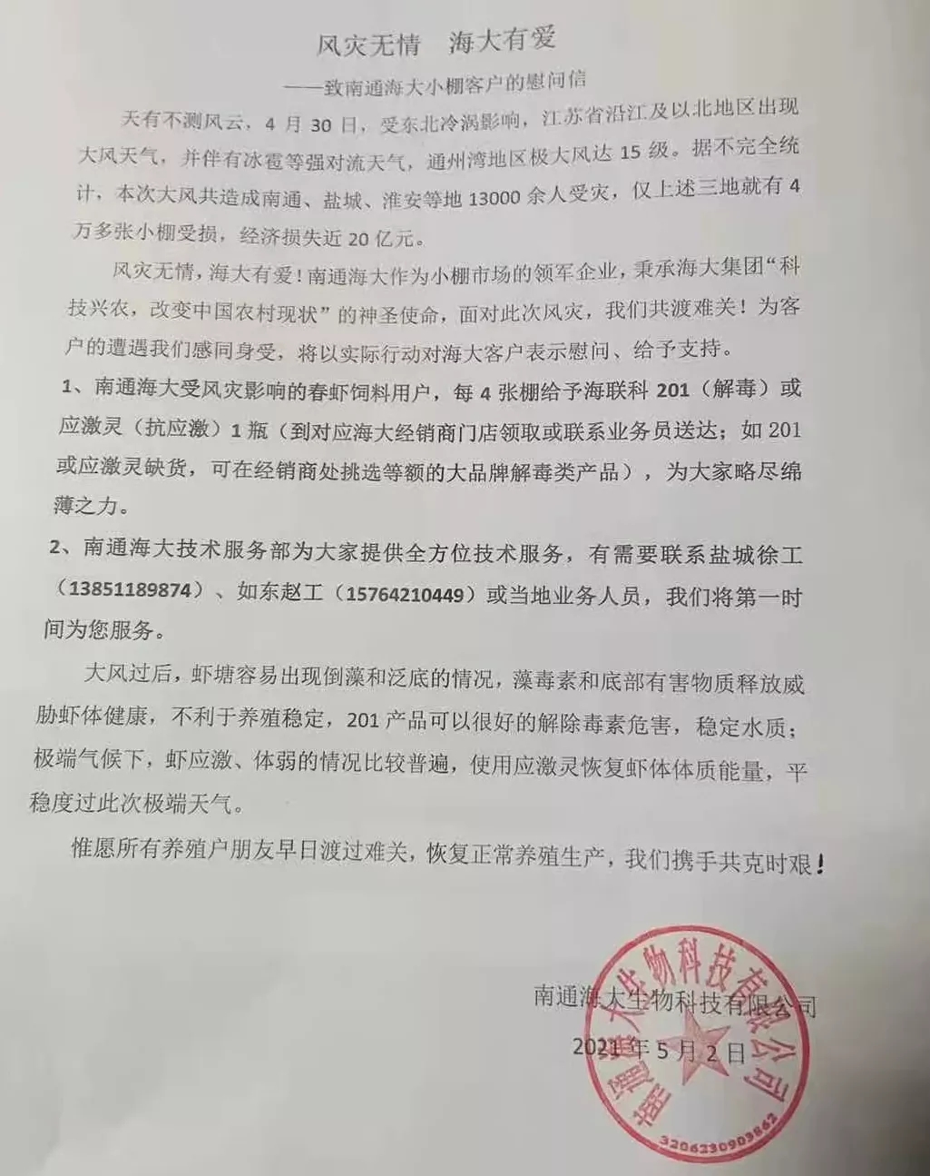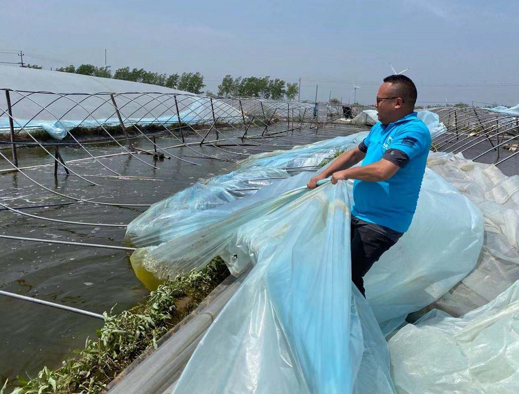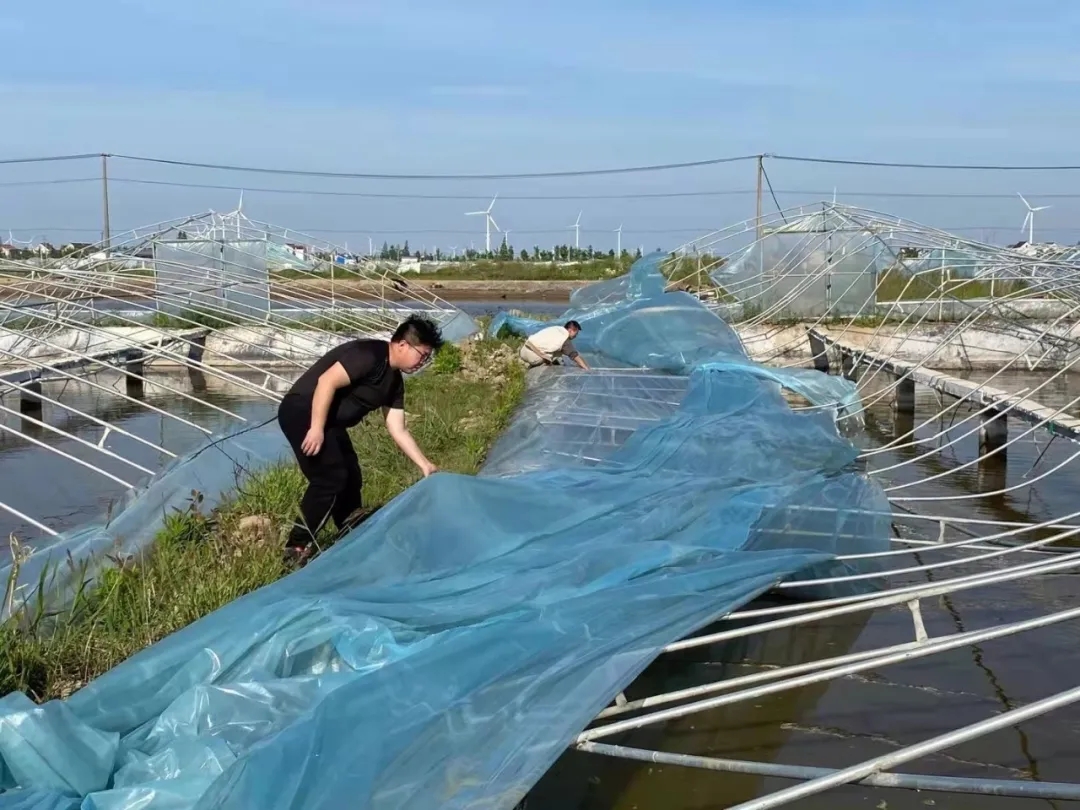 從風災襲擊至今天(5月6日),南通海大作為華東蝦料的領軍企業,也體現出了應有的責任和擔當,在總經理繆建海的組織帶領下,一直堅持為客戶送去暖心行動,贈送解毒和抗應激產品,工程師深入一線為客戶檢測水質,觀察蝦體情況。同時業務團隊成立了30人的搶修小分隊,集中到受災嚴重區域幫客戶蓋棚膜,挖排水溝,協助客戶恢復生產。目前已幫扶救援的受災小棚10000多張!驹斍辄c擊:15級!史上最慘烈風災襲擊江蘇小棚,華東蝦料領軍企業與養殖戶共克時艱】