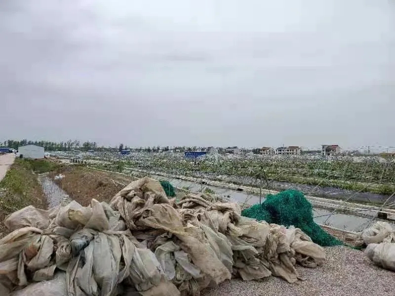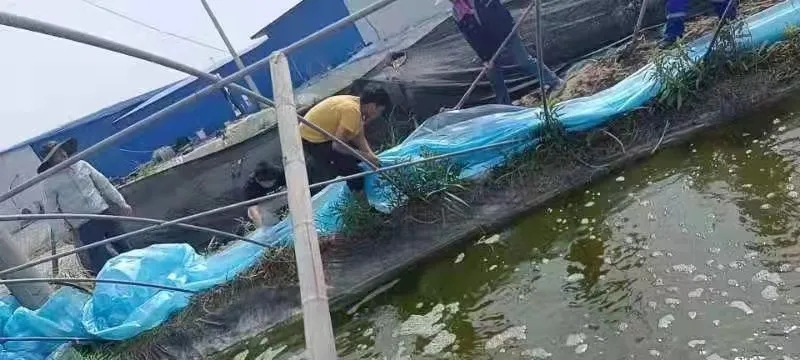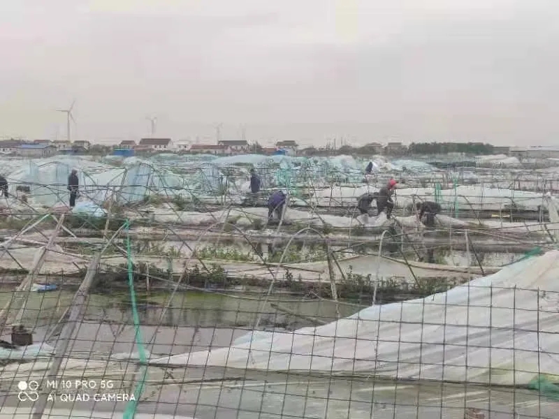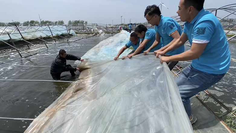 一、組織人手,助力用戶。公司第一時間召集各地區市場人員及行政后勤、生產員工80余人到達用戶塘口,幫助用戶恢復受損大棚,清理塘口廢棄物,為用戶鼓舞打氣。
