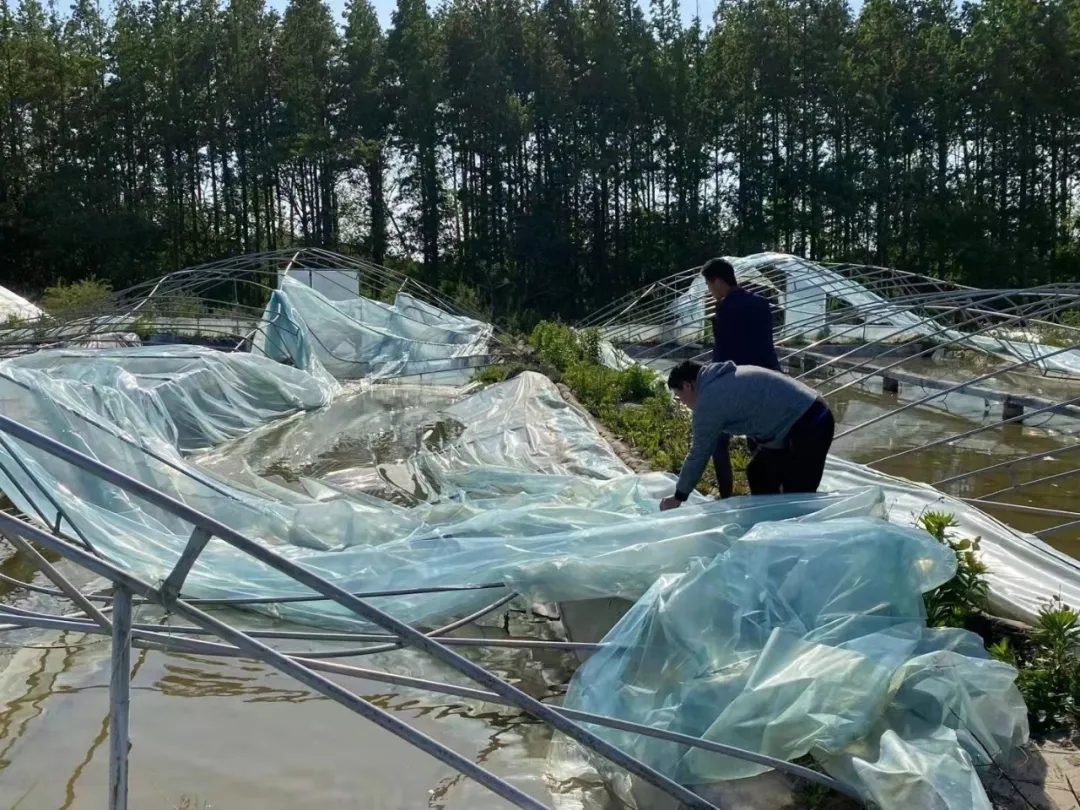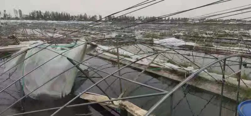 4月30日晚,受東北冷渦影響,江蘇省沿江及以北地區狂風大作,并伴有冰雹等強對流天氣,通州灣最大風力達到了15級。據不完全統計 ,本3000次強風造成了南通、鹽城、淮安等地13000余人受災,上述地區就有數萬張小棚受損,其中以如東弶港鎮、東凌鎮、通州灣受損的小棚至少有1萬張,再加上射陽、濱海,共有3萬多張小棚受創,這些養蝦小棚遭強風暴雨襲擊,大風吹飛吹掀棚膜、吹垮棚架、吹壞增氧供電設施,造成斷氧斷電,在塘養殖蝦損失慘重,預計經濟損失高達20億元。令人悲痛的是,長沙鎮富鹽村一位從業者在作業時被大風吹倒的電線桿砸死身亡,另外還有32位蝦農不同程度受傷。
