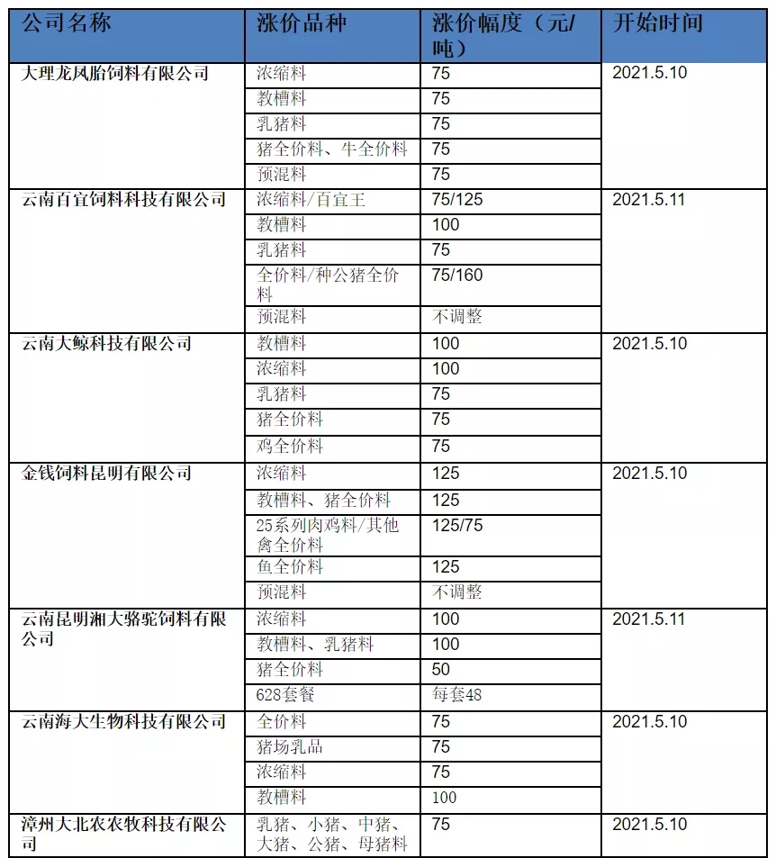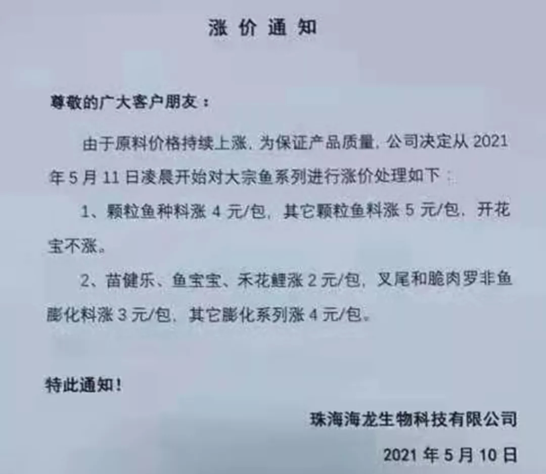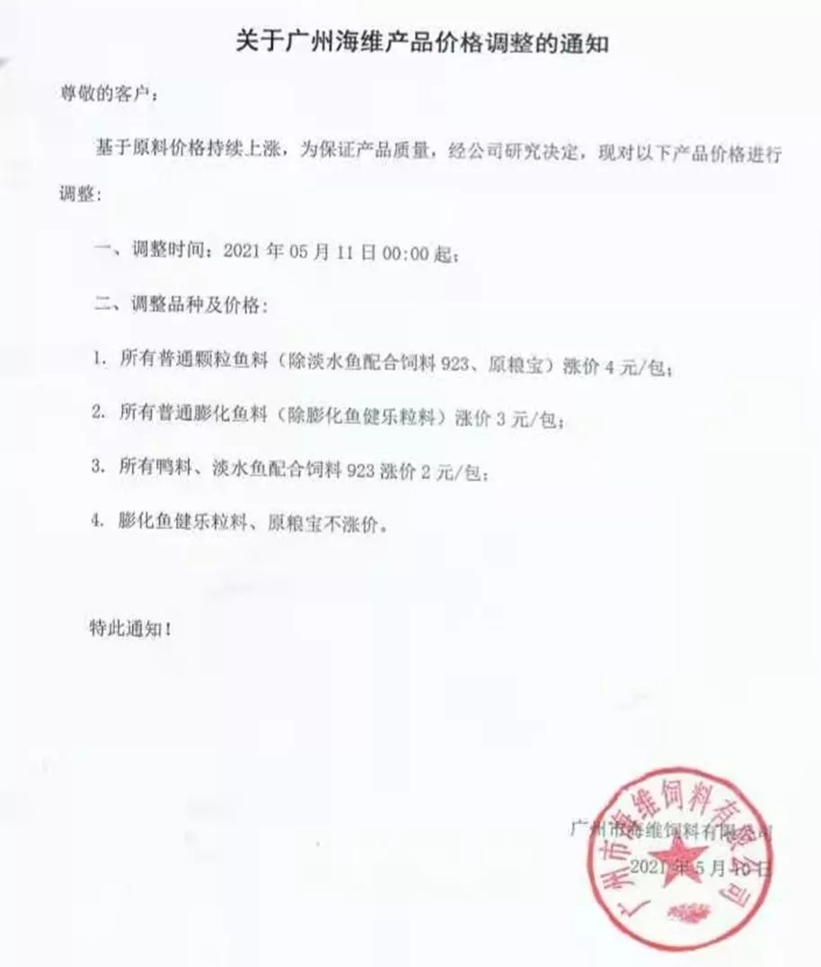 5月10日,海大集團旗下珠海海龍生物科技有限公司、廣州市海維飼料有限公司發布漲價通知,稱:由于原料價格持續上漲,為保證產品質量,將于2021年5月11日凌晨開始對大宗魚系列飼料進行漲價,其中顆粒魚料上漲4-5元/包,膨化魚料上漲3-4元/包,苗料漲、禾花鯉料2元/包。