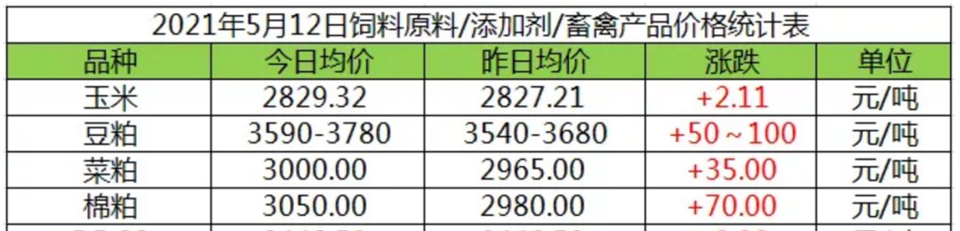 從以上兩表看出,主流市場(chǎng)的豆粕價(jià)格在2021年5月12日最高為3780元/噸,比2020年5月12日2810元/噸,上漲近1000元/噸。玉米同期比上漲近800元/噸。菜粕上漲近700元/噸。棉粕上漲超500元/噸。