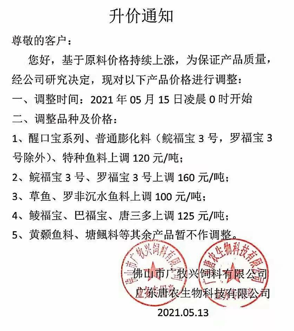 佛山廣牧興、廣東唐農(nóng)飼料漲價(jià)通知