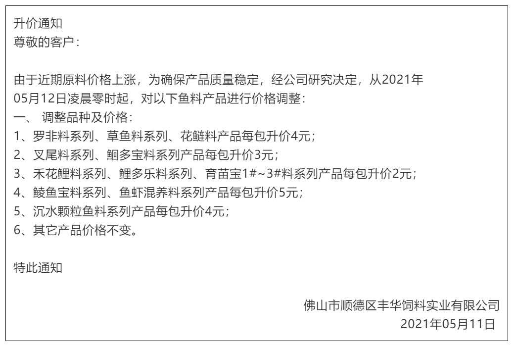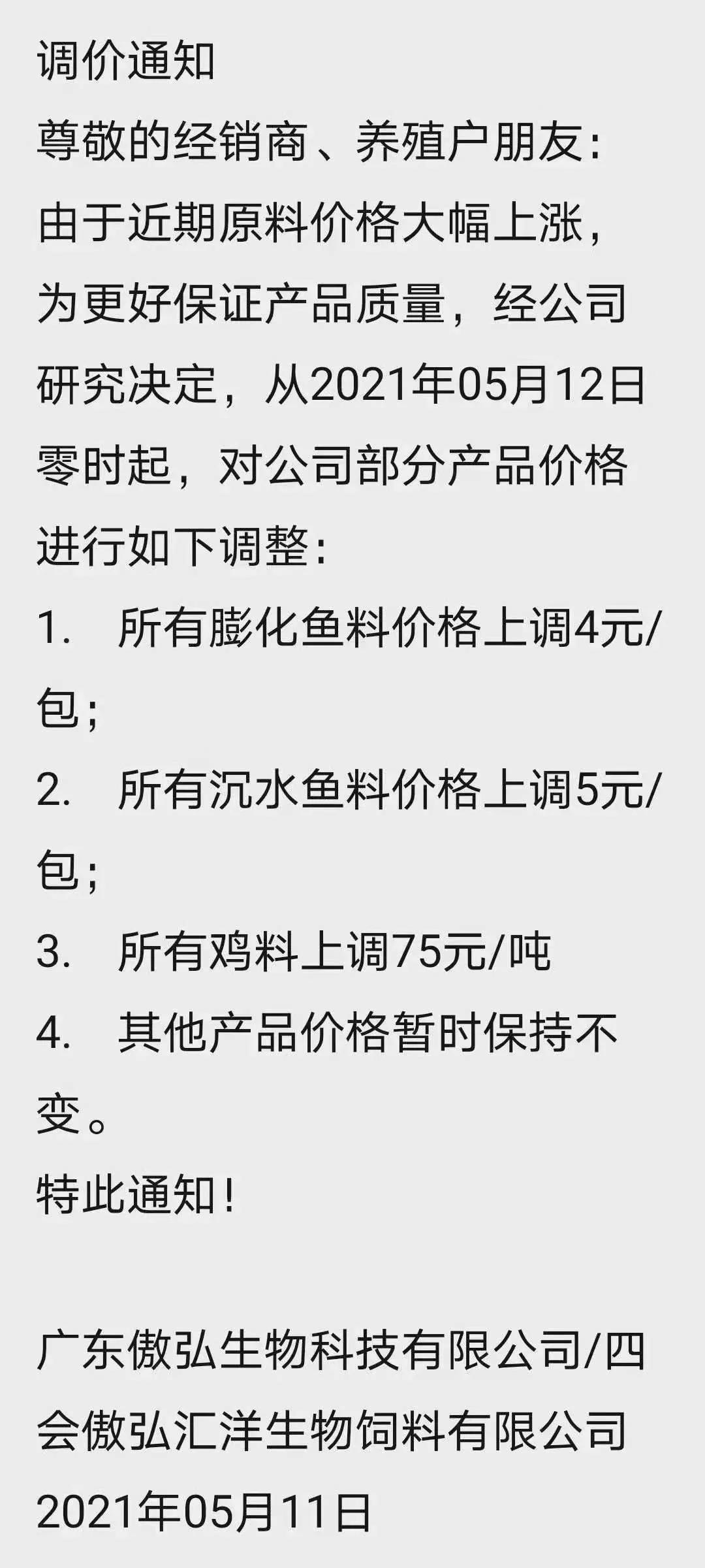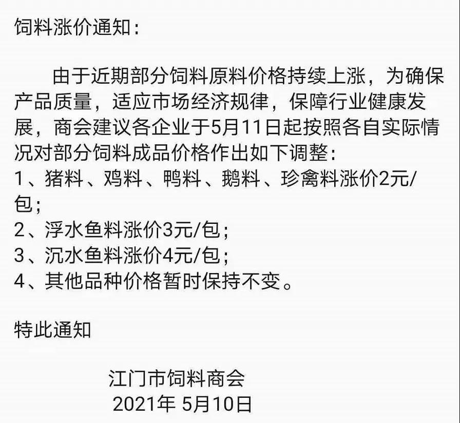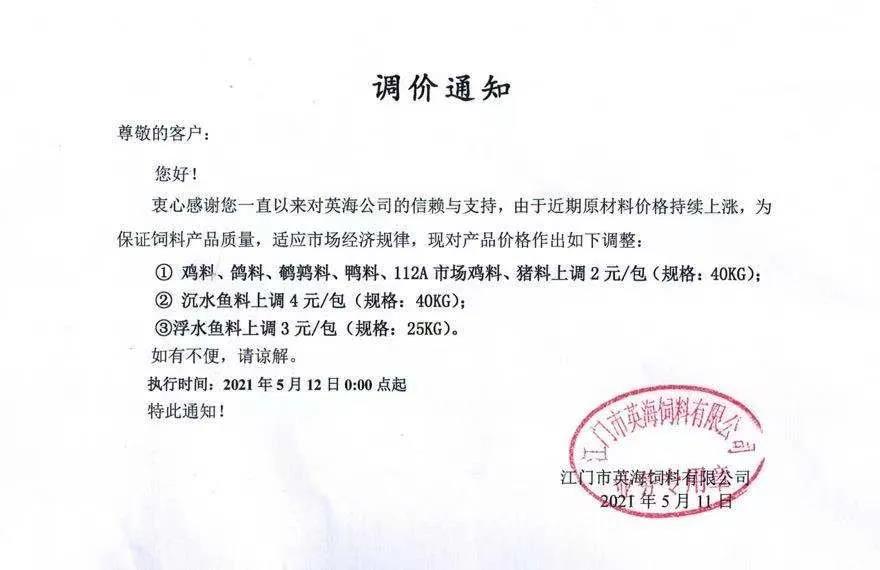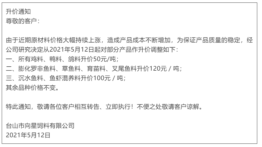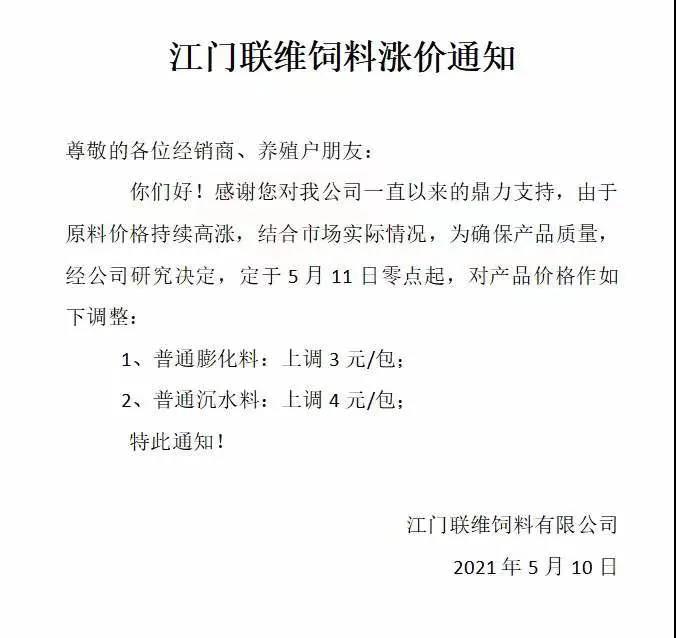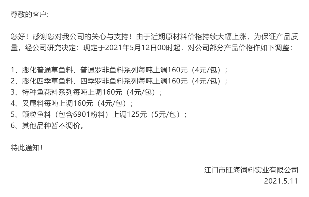 江門市旺海飼料實(shí)業(yè)有限公司漲價(jià)通知