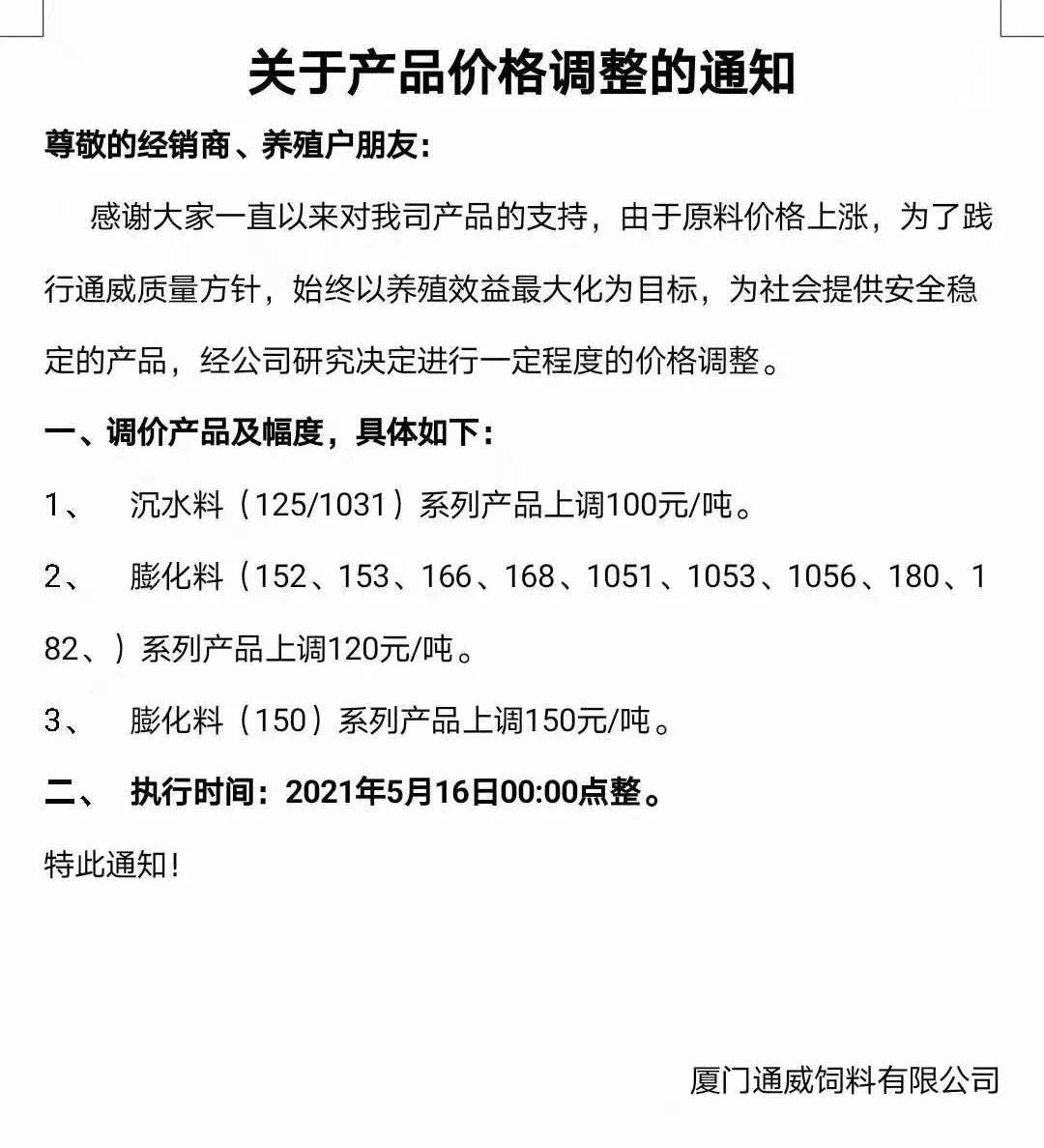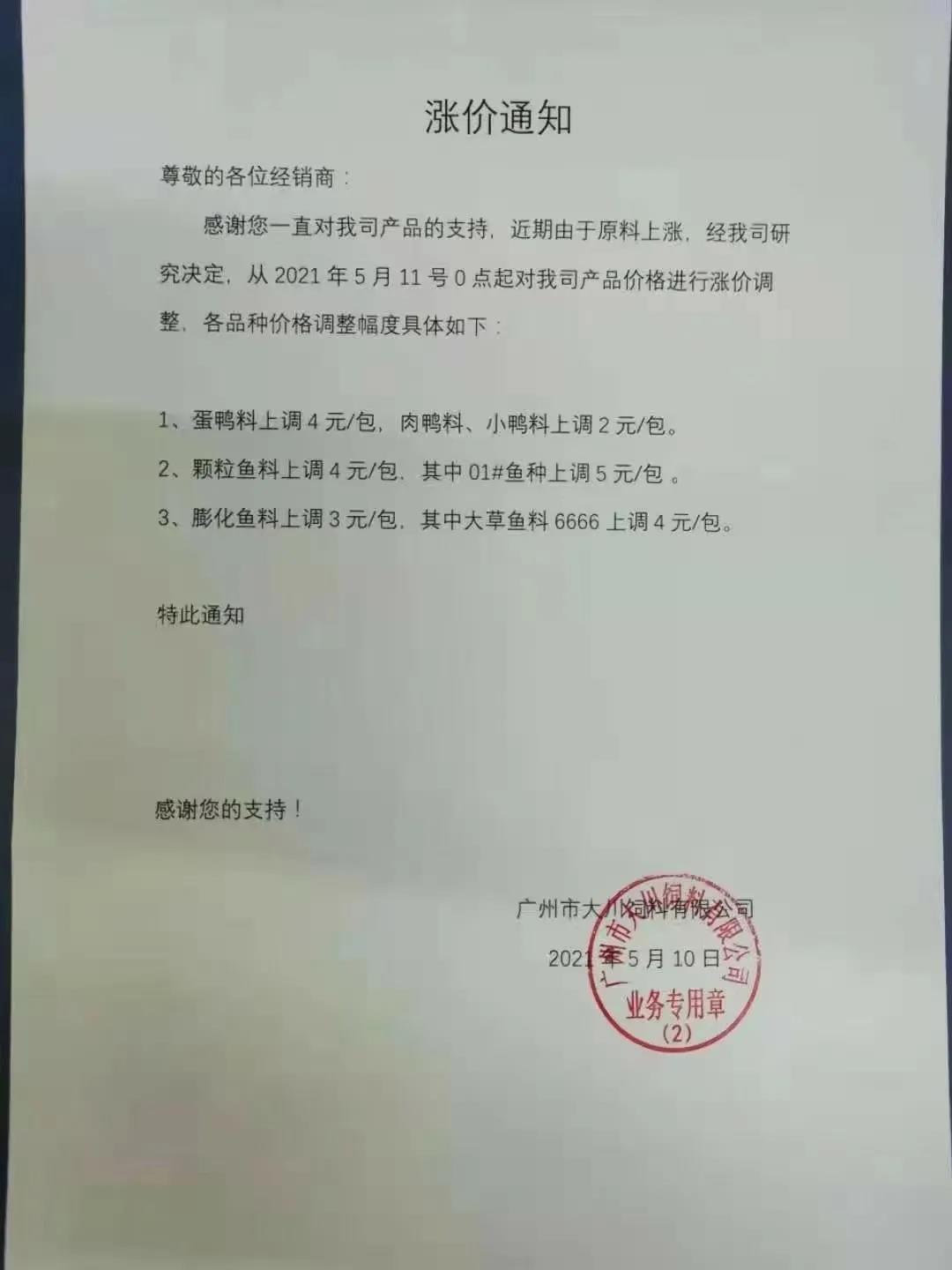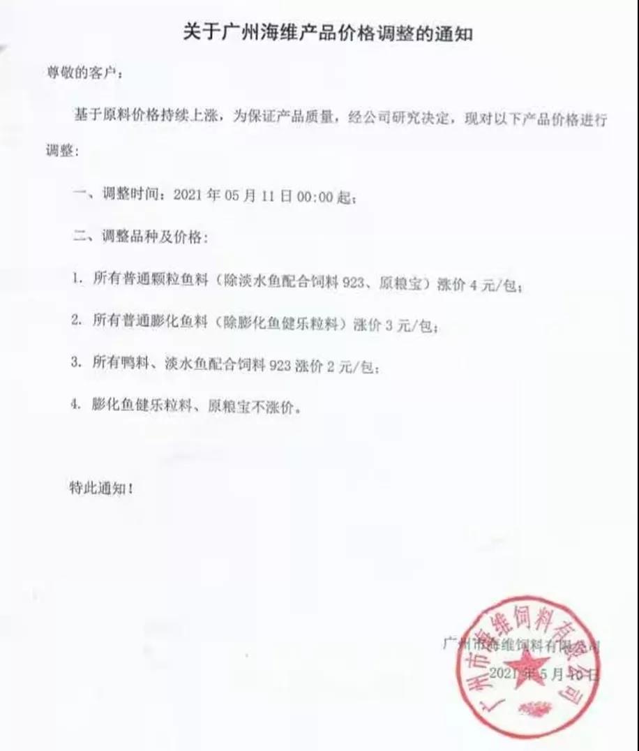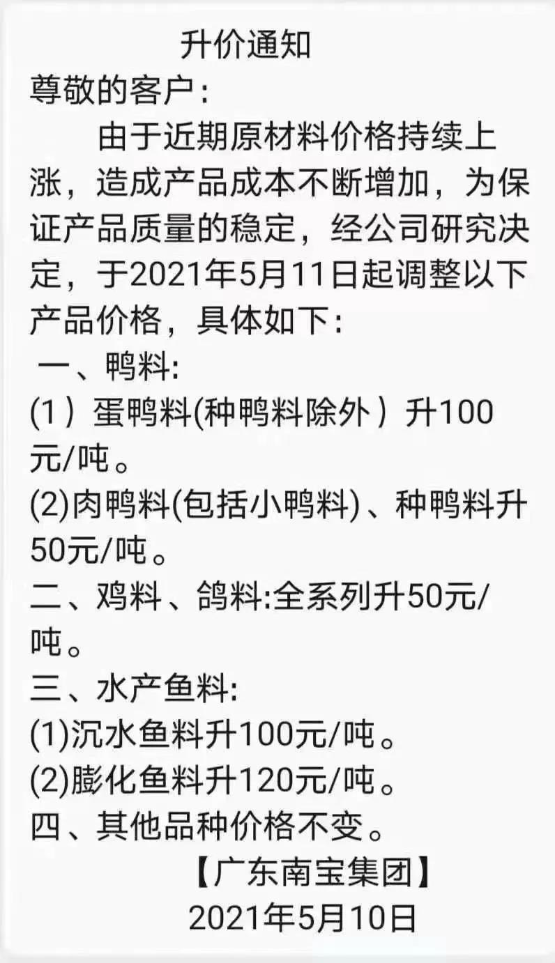 江門市旺海飼料實(shí)業(yè)有限公司漲價(jià)通知
