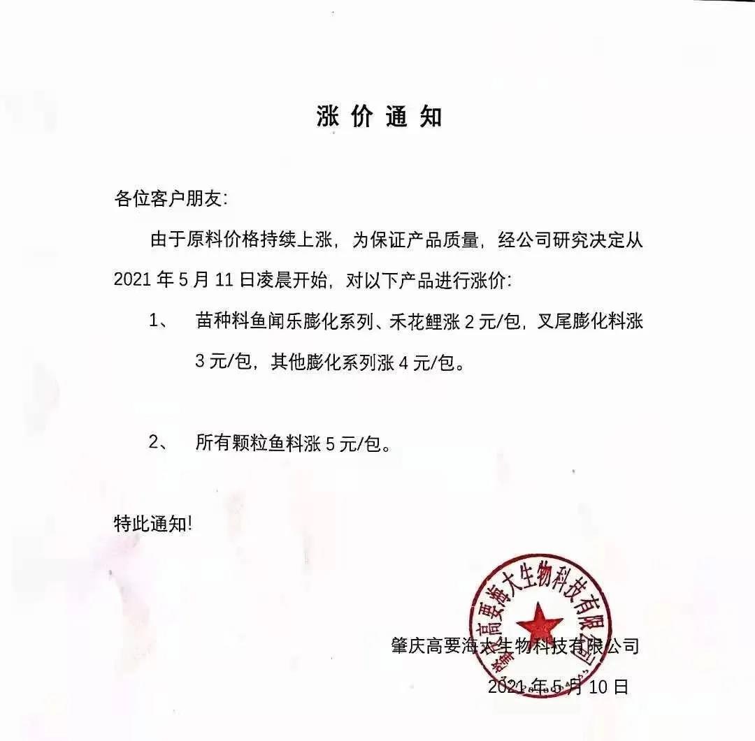 肇慶高要海大生物科技有限公司漲價(jià)通知