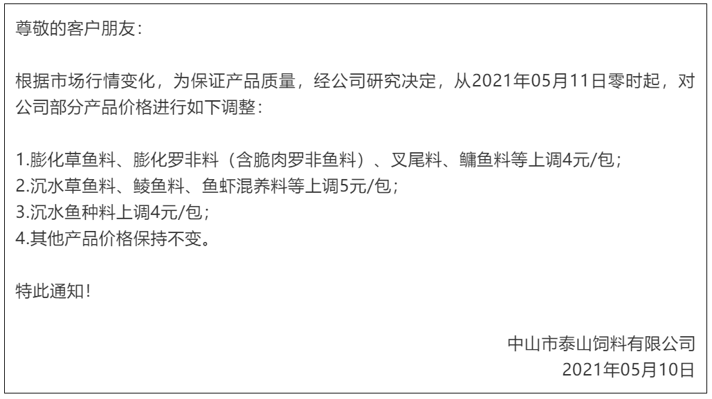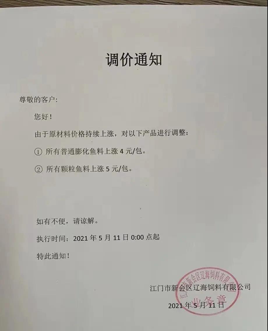 江門市新會(huì)區(qū)遼海飼料有限公司漲價(jià)通知