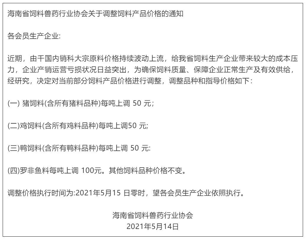 海南省飼料獸藥行業(yè)協(xié)會(huì)飼料漲價(jià)通知