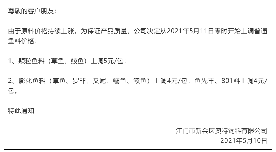 江門市新會(huì)區(qū)奧特飼料有限公司漲價(jià)通知