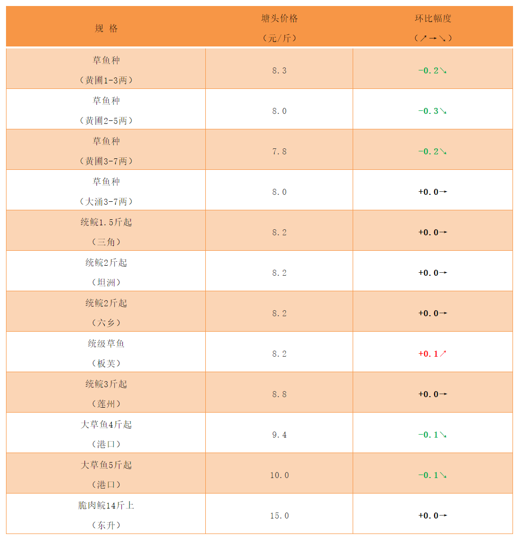 大草魚:本周大草魚價格略有回落,脆肉鯇大部分已定塘,需求稍有回落。但現階段脆肉鯇行情高漲,餐飲消費市場需求大。而且存塘量少,養殖戶惜售,預計在脆肉鯇行情未回落前,價格會保持高位。