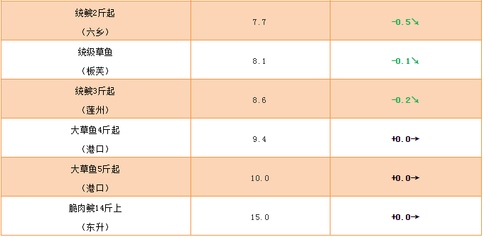 大草魚:本周大草魚價格保持穩定,繼續處于高位,脆肉鯇大部分已定塘,需求稍有回落。但現階段脆肉皖市場需求大,且存塘量少,養殖戶惜售,預計在脆肉鯇行情未回落前,價格將會保持高位。同時,近期天氣炎熱,需要注意底改消毒,持續高投喂率更需注意內服強肝健腸,預防肝臟負荷導致死魚。