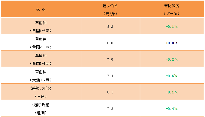 水產前沿網原創報道,草魚種:本周草魚種價格小幅回落,養殖戶走量大,預計后市行情逐步回落。此外,近期天氣多變,建議養殖戶做好雨后消殺工作。