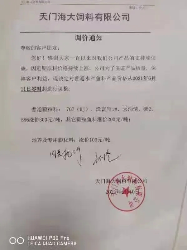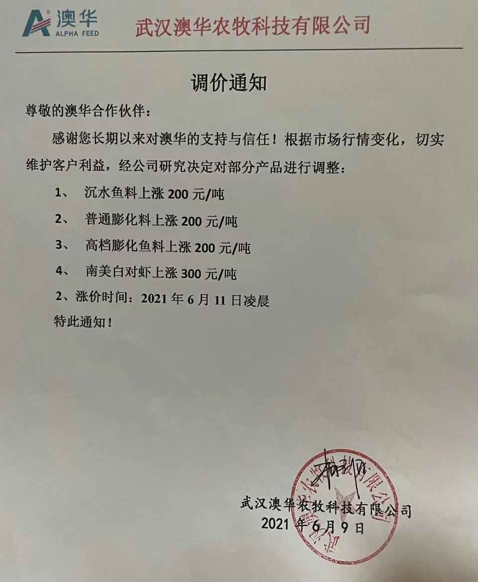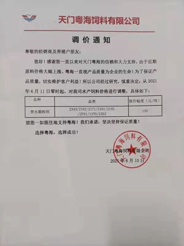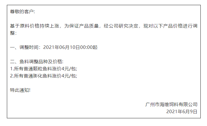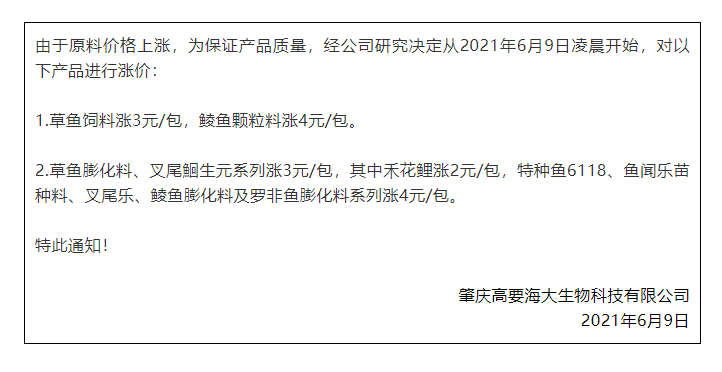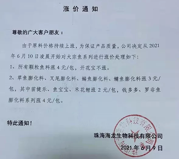 昨天,海大旗下幾大子公司珠海海龍、廣州海大、廣州海維、高要海大、新會奧特等同步上調普通淡水魚料價格,這是自5月11日在業中第一個挑起漲價企業,在不足一個月內又一次高調宣布飼料漲價,引發了行業不小震動、高度關注以及各種猜測。