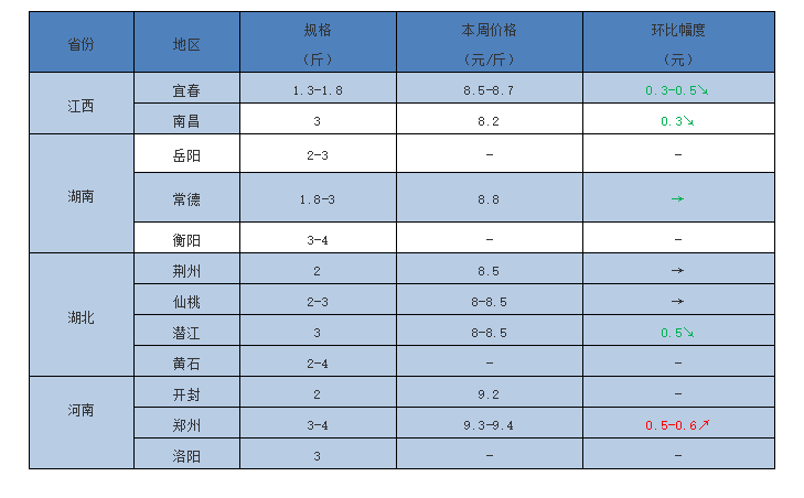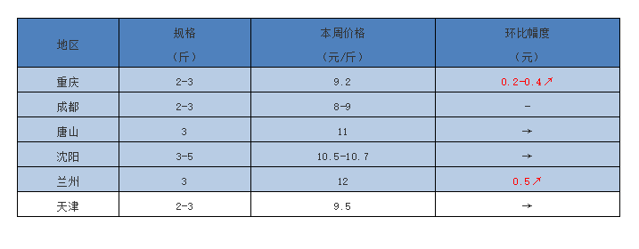 西南地區:大規格老魚存塘較少,價格穩中上調;而本月陸續上市的小規格新魚則暫時不是很受市場青睞,行情有所下調,且報價也較亂。成都2-3斤規格走市場塘頭價8元左右,環比上周下調0.8-1元/斤;個別瘦身魚能賣到9元/斤。重慶2-3斤規格老魚塘頭價9.2元/斤,環比上周上調0.2-0.4元/斤。廣元2-4斤塘頭報價9-9.5元/斤,同上周價格。綿陽新魚開始上市,2斤上規格9.5元/斤,環比上周價格下調0.5元/斤,2斤以下8.5-9元/斤,環比上周下調0.2-0.7元/斤。