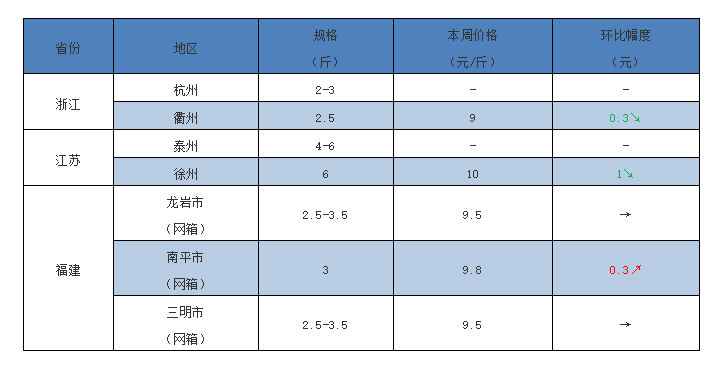 浙江:良好行情時期刺激養戶投喂膨化料催魚生長,隨著目前頭批大苗陸續大量上市,市場上貨源供應多,價格相應下行。衢州2-3斤規格塘頭報價9元/斤,環比上周報價下調0.3元/斤。