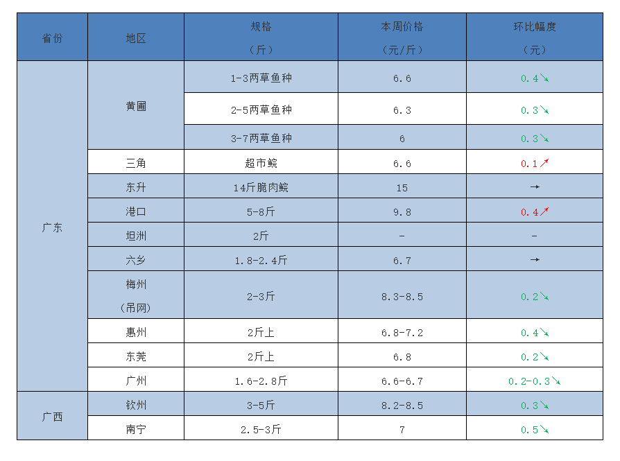 湖北:荊州2斤上規(guī)格草魚塘頭8.5元/斤,暫與上周價格持平。仙桃老魚很少,新魚也要下個月才上市,但豬肉價格下滑后,魚價也沒有前段時間好,尤其是偏小規(guī)格的,2-3斤規(guī)格本周報價7.5元/斤,環(huán)比上周下調(diào)0.5-1元/斤,3斤上規(guī)格9元/斤,保持上周價格。潛江市場供求近日暫時平衡,3斤規(guī)格8.5-9元/斤,與上周價格維持一致。