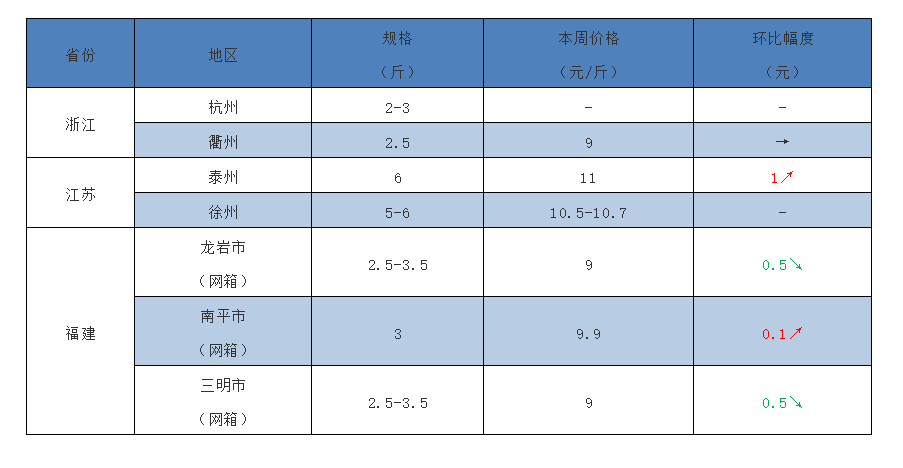 福建:新苗規(guī)格達到1.5-2.3斤左右,出魚仍以內(nèi)銷為主,也有少量外銷流向江西市場。目前當(dāng)?shù)夭蒴~價格處于歷史高位,養(yǎng)戶希望抓住機會盡早賣魚回收利潤,以免夜長夢多,下滑的行情,便是積極出魚的體現(xiàn)。龍巖有魚的養(yǎng)戶擔(dān)心后期扎堆上市,開始積極銷售1.8斤以上規(guī)格魚,可能會對市場有一定沖擊;魚塘草魚2.5-3.5斤規(guī)格均價8.2元/斤,環(huán)比上周繼續(xù)下調(diào)0.3元/斤;水庫網(wǎng)箱同規(guī)格9元/斤,環(huán)比上周報價下調(diào)0.5元/斤。三明水庫網(wǎng)箱草魚2.5-3.5斤規(guī)格報價下調(diào)0.5元/斤。南平閩江水庫網(wǎng)箱草魚老魚基本所剩無幾,而新魚普遍還需2個月才到上市規(guī)格,大規(guī)格魚供應(yīng)緊缺促使行情上漲。目前2-3斤規(guī)格本地魚車報價9.3元/斤,同上周價格;3斤上規(guī)格9.9元/斤,環(huán)比上周價格上調(diào)0.1元/斤。