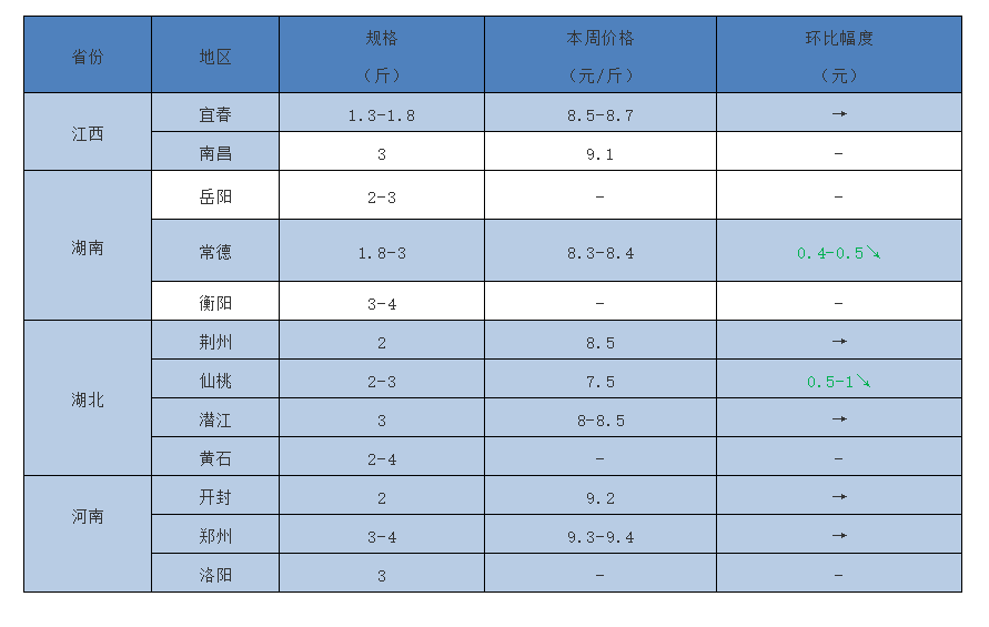 西南地區(qū):四川近日進入雨季,雨水增多,雨勢頗大,或有如去年一般引發(fā)洪水的可能性,宜提高警惕做好防護工作,以免造成損失。大規(guī)格老魚存塘較少價格較好,而小規(guī)格新魚暫時不是很受市場青睞,報價較低較亂。成都2-3斤規(guī)格走市場塘頭價8元左右,個別瘦身魚9元/斤,價格暫時平穩(wěn)。重慶有部分新魚開始上市,但供應(yīng)量比較少,2-3斤規(guī)格新魚塘頭價9.2元/斤,環(huán)比上周上調(diào)0.2-0.4元/斤。瀘州去年8月份水花開始上市,2.5-3斤塘頭報價9元/斤。綿陽新魚開始上市,2斤上規(guī)格8.8元/斤,環(huán)比上周價格下調(diào)0.7元/斤,2斤以下8.5-9元/斤,環(huán)比上周下調(diào)0.2-0.7元/斤。