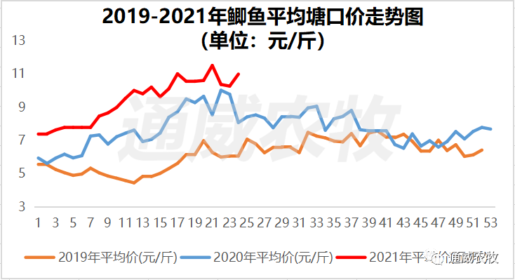 水產前沿網報道,鯽魚從近三年行情波動情況來看,2021年整體行情高于前兩年,同期對比1-24周均價,2019年均價5.4元,2020年均價7.6元,2021年均價9.3元;整體魚價行情好,成都、岳陽等地區今年投苗同期增長近30%;江蘇一帶因鯽魚魚病發病率高,大豐市存塘同比減少50%,濱海縣90%以上養殖戶轉養黃金鯽;四川地區因年初魚價行情好養殖戶大量出魚導致現在存塘同期減少20——30%。