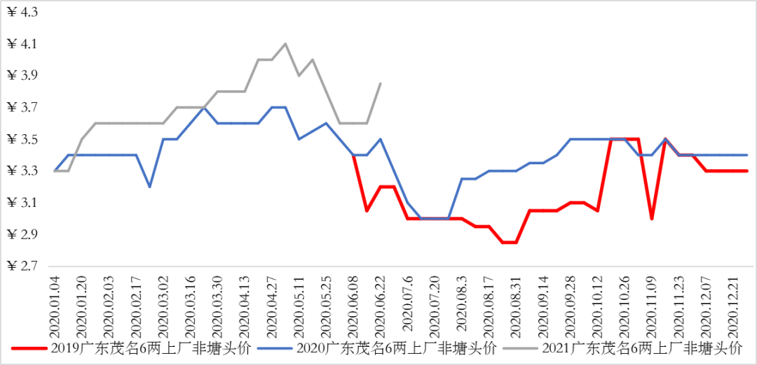 粵西地區(qū):湛江0.6-1斤規(guī)格廠非塘頭價(jià)3.6元/斤,加成最高3.85元/斤,環(huán)比上周上調(diào)0.1元/斤;1斤上規(guī)格4.6元/斤,環(huán)比上周上調(diào)0.05元/斤;茂名0.6-1斤規(guī)格廠非塘頭底價(jià)3.6元/斤,加成最高3.85元/斤,環(huán)比上周上調(diào)0.25元/斤;1-1.6斤規(guī)格塘頭正價(jià)4.65元/斤,環(huán)比上周上調(diào)0.1元/斤;兩地市場(chǎng)非1.5斤上規(guī)格5.3-5.4元/斤,維持上周價(jià)格。