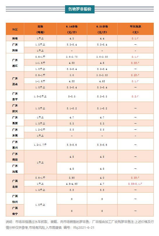 近期加工廠對(duì)羅非原料魚收購(gòu)需求上升,但主產(chǎn)區(qū)海南與粵西可供上市規(guī)格魚數(shù)量有點(diǎn)不足,因而拉動(dòng)中小非漲價(jià);海南1斤上廠非本周收購(gòu)價(jià)上調(diào)0.1元/斤,粵西0.6-1斤規(guī)格最高上調(diào)0.25元/斤,1-1.6斤規(guī)格上調(diào)0.05-0.1元/斤。除了海南和粵西,廣西廠非貨源也較為緊張,價(jià)格亦略有上調(diào);北海0.6-1斤規(guī)格上調(diào)0.05元/斤,1-3斤規(guī)格上調(diào)0.05-0.1元/斤,1.6斤上更是賣出5元/斤的高價(jià)。其他產(chǎn)區(qū)新魚則未大量達(dá)到上市規(guī)格,出塘大魚比例較低,裝車走量有限,市場(chǎng)供求較為均衡,行情相對(duì)平穩(wěn)。不過(guò),隨著湛江吳川解封,羅非恢復(fù)正常供應(yīng)與消費(fèi),其他原本受疫情管控影響的區(qū)域如佛山,餐飲堂食亦陸續(xù)開始解禁,相信后市需求理應(yīng)上升,市場(chǎng)非行情或有望稍稍上調(diào)。