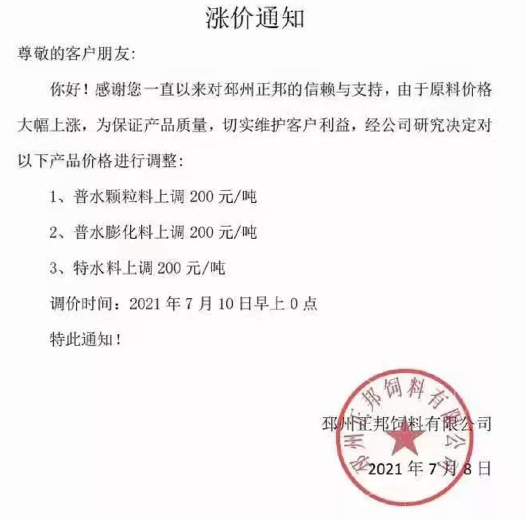 7月10日邳州正邦飼料有限公司漲價
