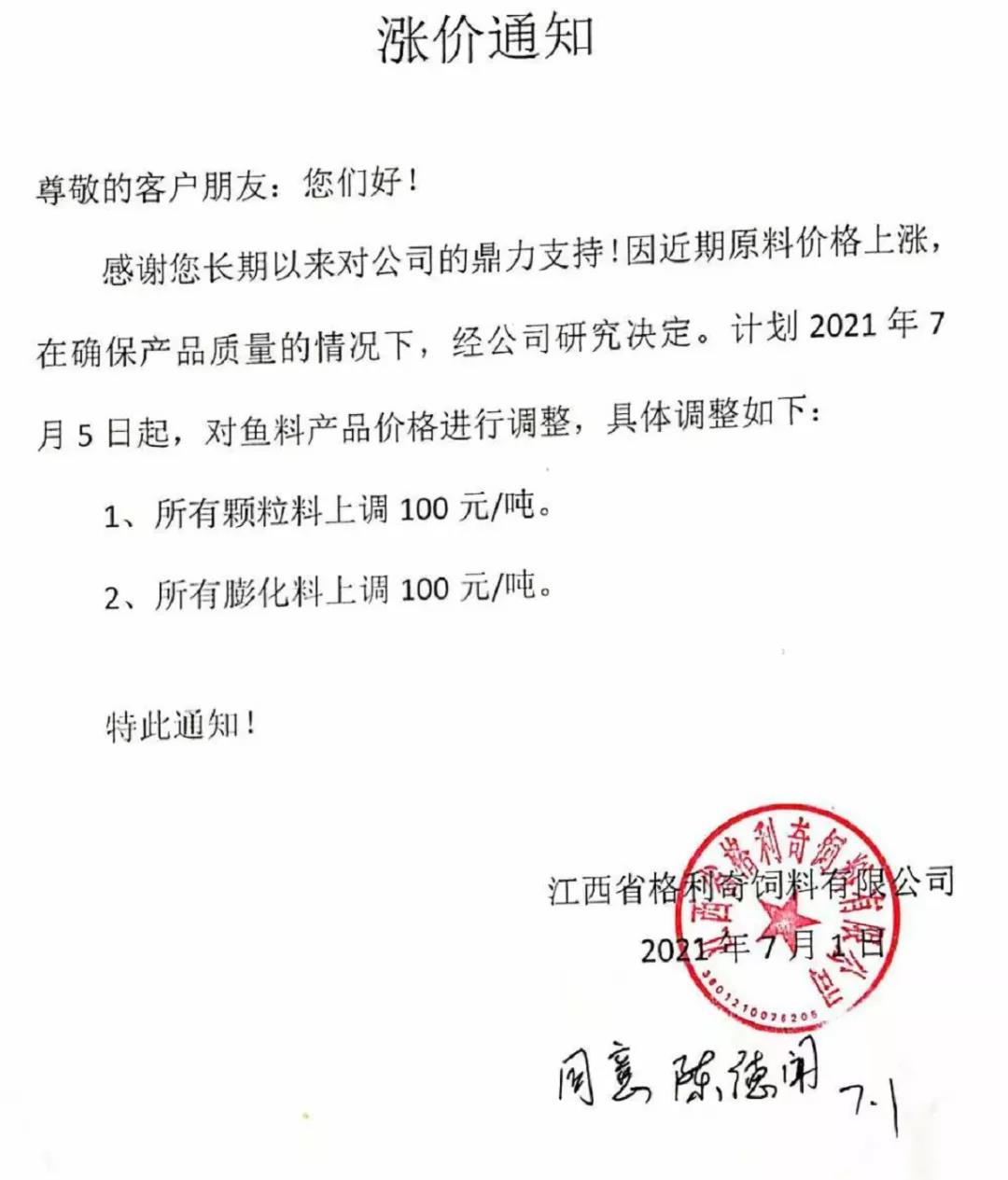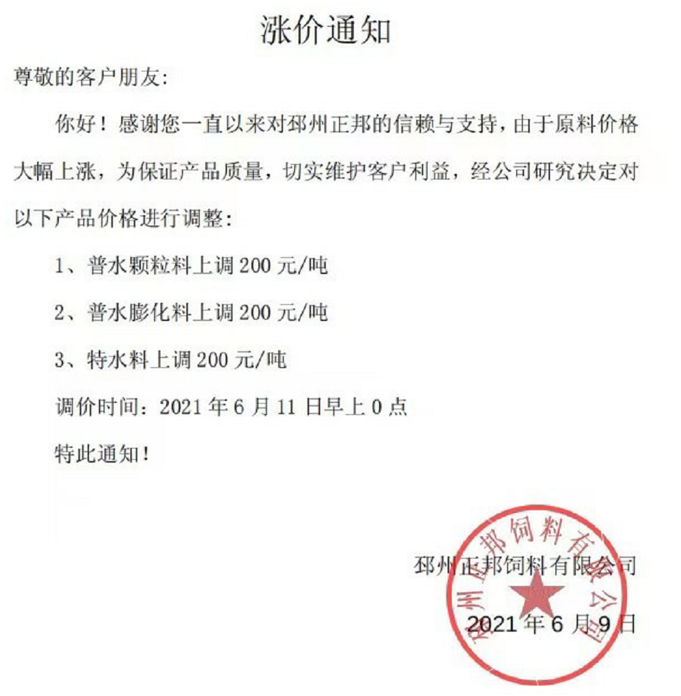江西格力奇飼料有限公司漲價通知