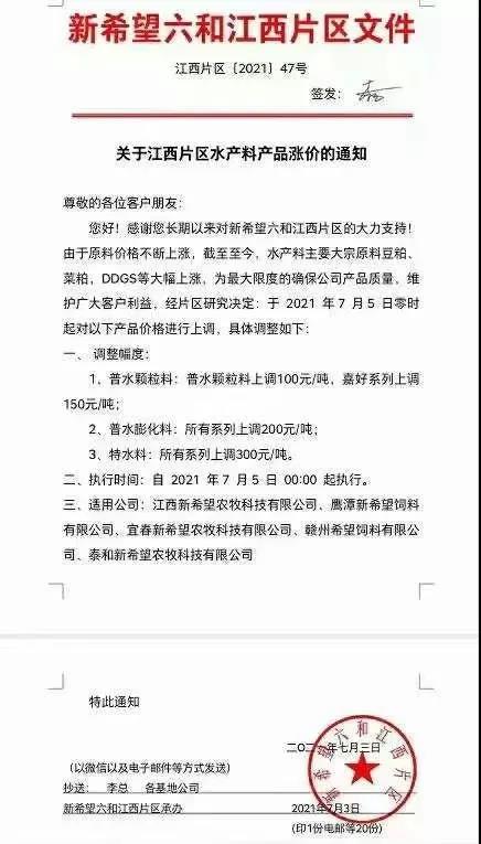 新希望六和江西片區漲價通知