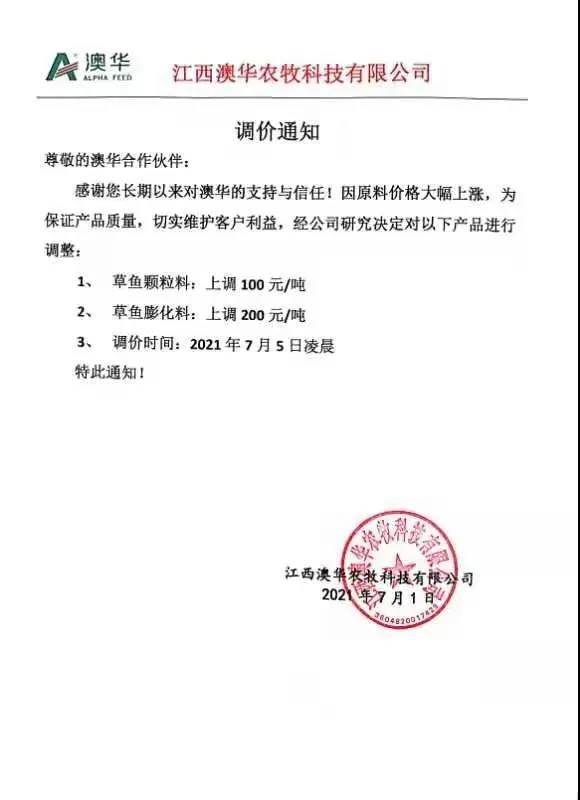 江西澳華農牧科技有限公司漲價通知