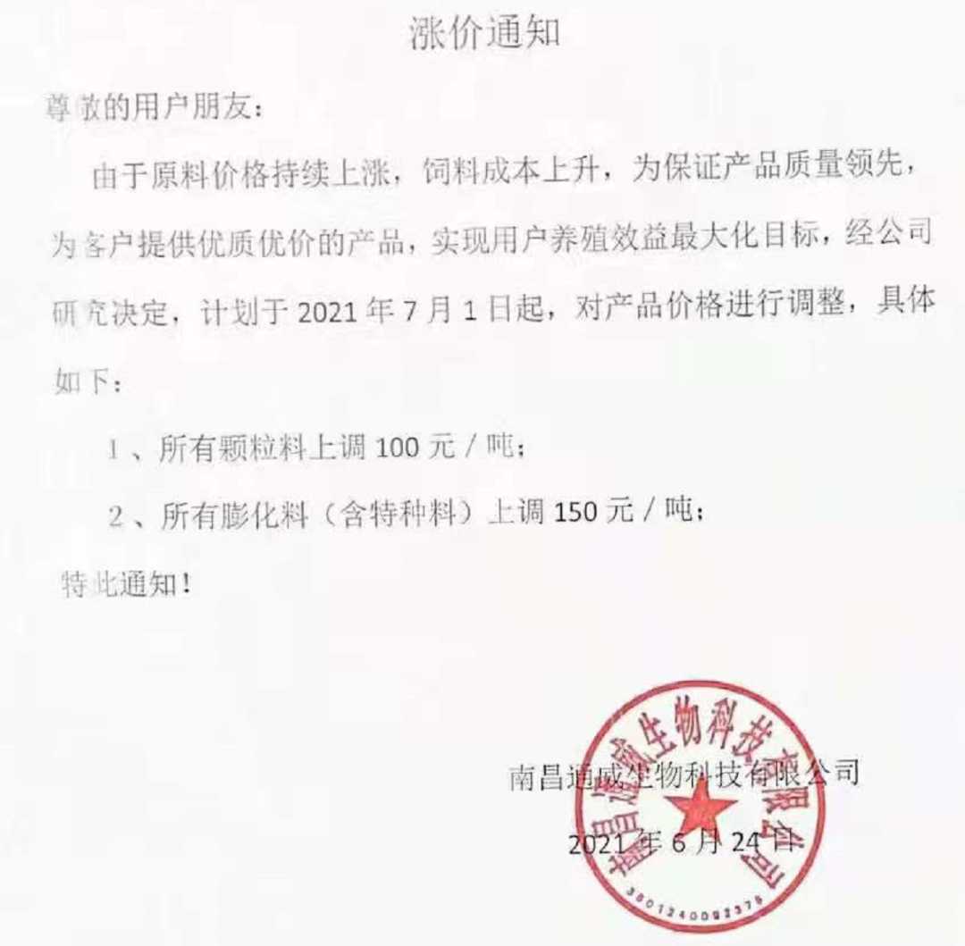 南昌通威生物科技有限公司漲價通知