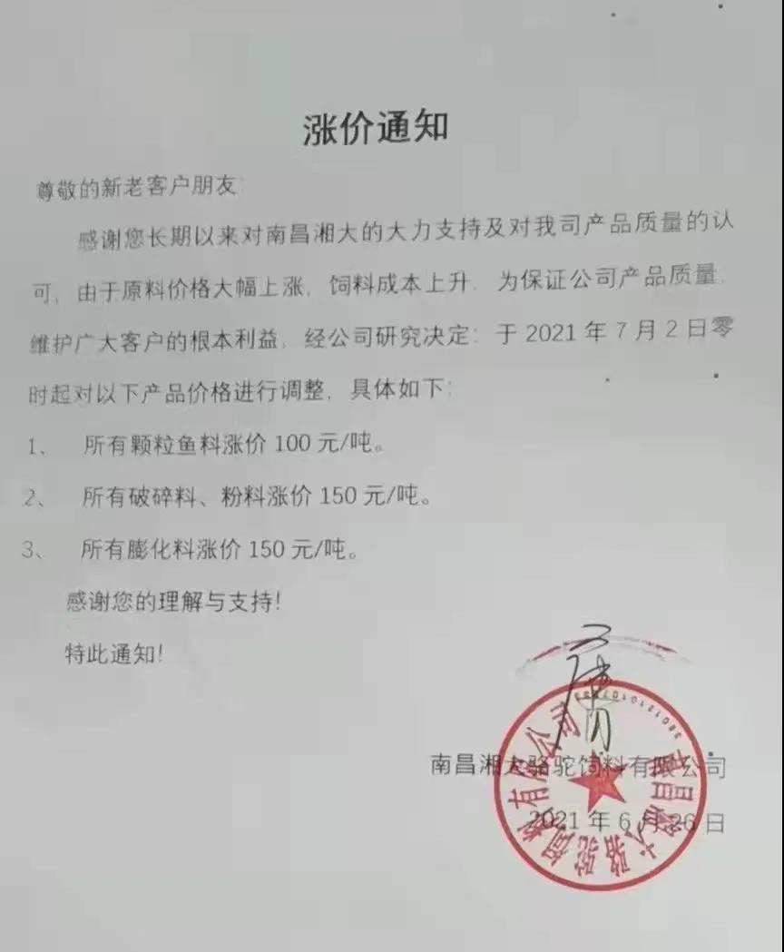 南昌湘大駱駝飼料有限公司漲價通知