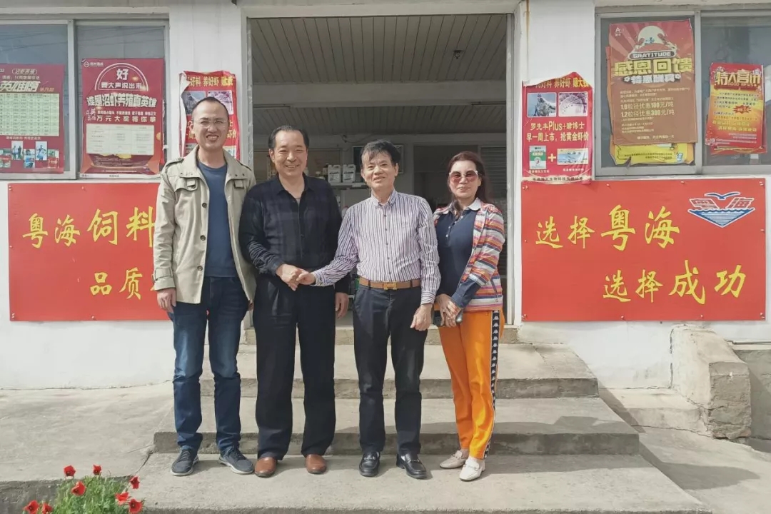粵海飼料集團董事長鄭石軒(右二)、董事徐雪梅(右一)實地考察江蘇市場,江蘇粵海總經理黃志勇(左一)陪同拜訪高郵區域經銷商吳登華(左二)