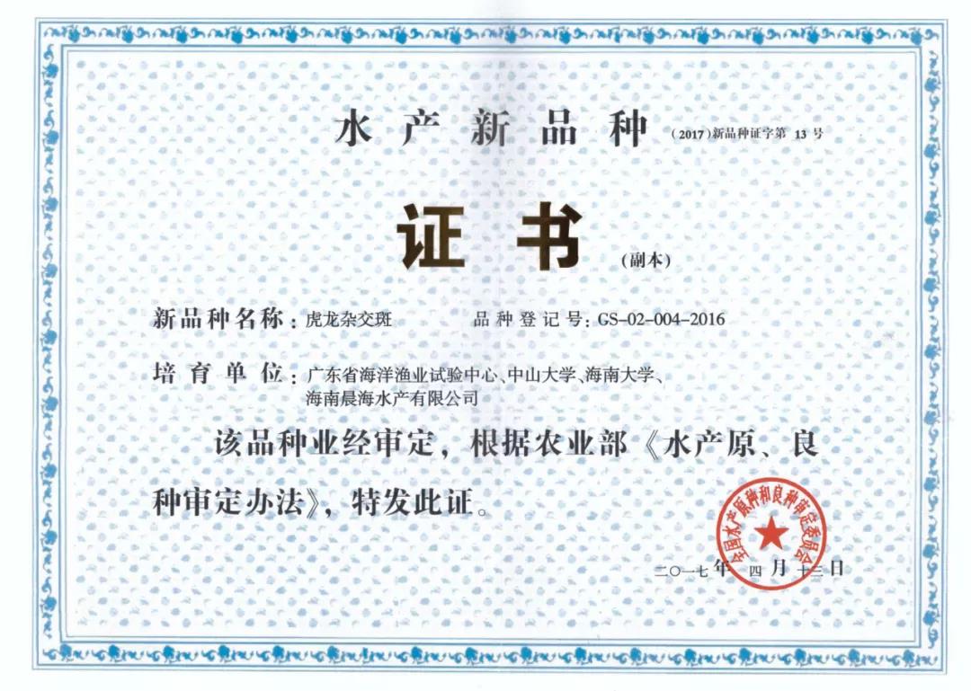 “虎龍雜交斑”水產(chǎn)新品種證書