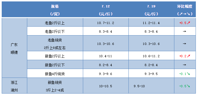 水產(chǎn)前沿網(wǎng)原創(chuàng)報(bào)道,本周廣東生魚老魚2斤以上11.2-11.4元/斤,比上周上漲了0.5元/斤;2斤以下報(bào)價(jià)8.3-8.4元/斤,跟上周一樣;老魚統(tǒng)貨2斤上8成左右報(bào)10.3-10.6元/斤,保持不變。新魚4斤統(tǒng)貨9.3-9.5元/斤,比上周稍微下跌了0.1元/斤;新魚2斤上報(bào)價(jià)10.6-11元/斤,比上周上漲了0.2元/斤; 2斤以下報(bào)價(jià)8.2-8.4元/斤,跟上周一樣。每塘魚的最終成交價(jià)格都是根據(jù)魚頭大小以及2斤以上成數(shù)來決定的。廣東生魚上周的市場行情主要是大魚銷量好,價(jià)格有小幅的上漲,銷量比之前多。小魚價(jià)格比較穩(wěn)定,市場需求量比較穩(wěn)定。接下來大魚還會保持高位運(yùn)行,小魚價(jià)格暫時(shí)穩(wěn)定。