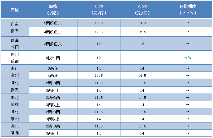 3、湖北黃顙魚(yú)2-3兩多魚(yú)頭價(jià)格在11.5元/斤,3兩以上報(bào)價(jià)14元/斤。銷量跟上周差不多,大魚(yú)需求量相對(duì)大一些,后市價(jià)格變化不大。