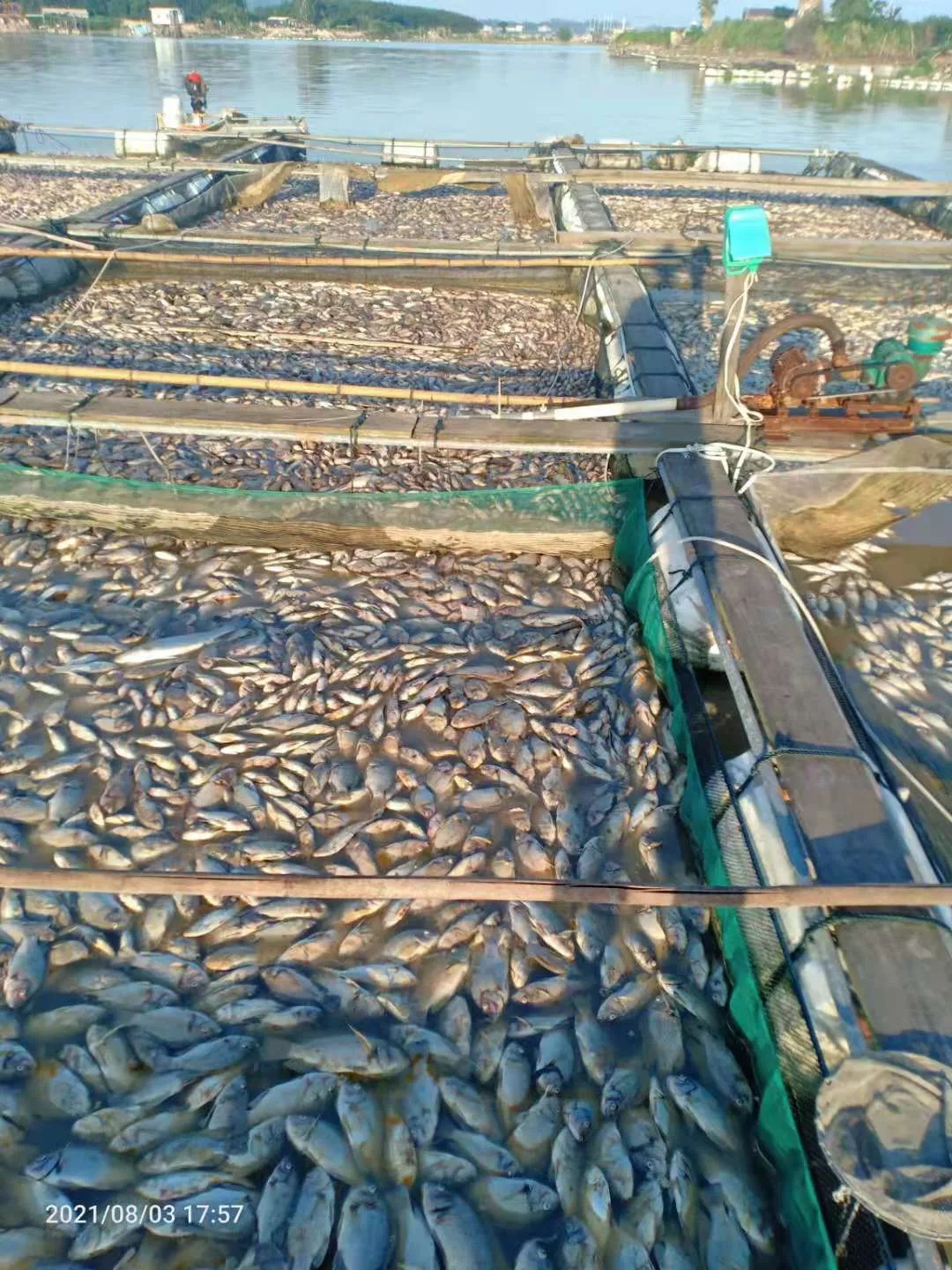 邱老板是此輪損失最大的養(yǎng)殖戶,據他描述,“我8月2日當天在魚排,晚上10點時半發(fā)現(xiàn)魚不對勁,明顯聞到上游水有臭味,河水黑乎乎的。半個小時左右,魚就全死完了。我當時也叫工人緊急搶救,把增氧機、水車、氣泵全部打開,但根本沒有效果。整個鹿溪梅宅段魚全部死亡漂在水面,包括野生的。”