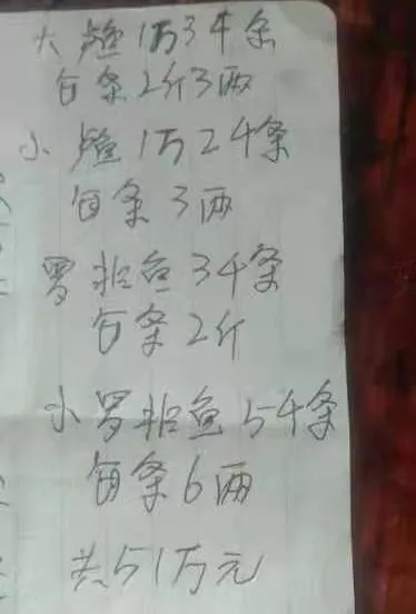 當?shù)仞B(yǎng)殖戶楊保福統(tǒng)計,“2斤3兩鱸魚1萬3千條;3兩鱸魚1萬2千條;2斤羅非魚3千條;6兩羅非魚5千條,總計損失51萬元。”