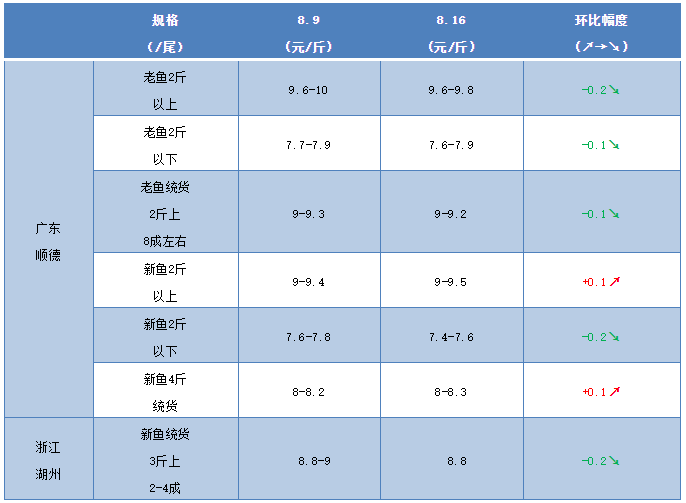 水產前沿網原創報道,1、本周廣東生魚老魚2斤以上9.6-9.8元/斤,比上周下跌了0.2元/斤;2斤以下報價7.6-7.9元/斤,比上周最多下跌了0.1元/斤;老魚統貨2斤上8成左右報9-9.2元/斤,比上周最多下跌了0.1元/斤。新魚4斤統貨8-8.3元/斤,比上周上漲了0.1元/斤;新魚2斤上報價9-9.5元/斤,比上周上漲0.1元/斤;2斤以下報價7.4-7.6元/斤,比上周下跌0.2元/斤。每塘魚的最終成交價格都是根據魚頭大小以及2斤以上成數來決定的。