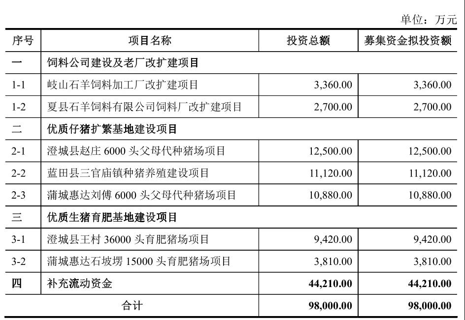 募集資金去向:圍繞公司生豬養(yǎng)殖及產(chǎn)業(yè)鏈上下游開(kāi)展,進(jìn)一步提升公司的競(jìng)爭(zhēng)力。
