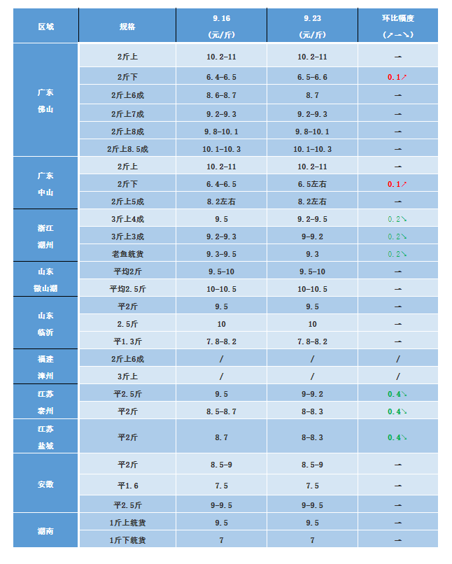 廣東佛山本周行情穩定,中魚微漲。臨近節假日,本周廣東生魚市場暢銷,流通商定魚積極性,大魚行情向好,帶動中魚上漲0.1元/斤,養殖戶出魚積極性強。目前2斤上大魚塘頭價格10.5-11元/斤,2斤下塘頭價6.4-6.5元/斤,2斤上5成塘頭價8.2元/斤左右,2斤上6成8.7元/斤左右。業界表示目前大魚市場存貨量少,雖然目前有少量新魚上市,但是隨著國慶假期到來,市場銷量增加,在各地疫情穩定的情況下魚價或許穩中有漲。