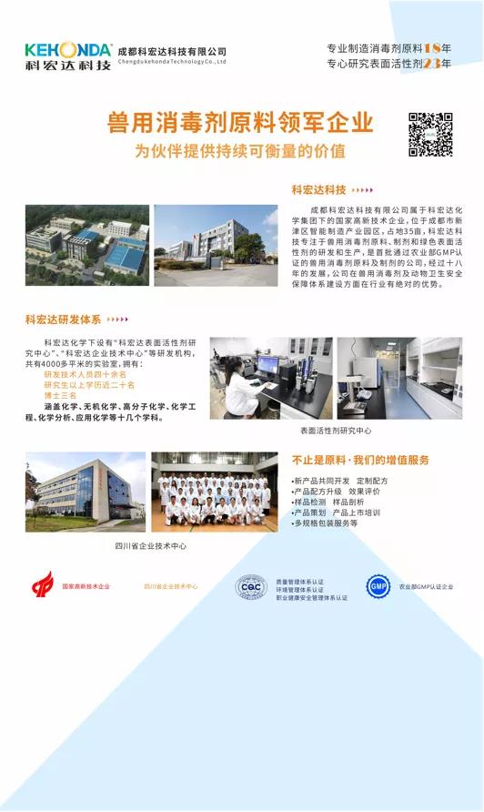 科宏達的動保產品體系有兩大類,一是原料型產品,包括聚維酮碘、季銨鹽類、戊二醛、除臭殺菌類、胍類、功能輔料(表面活性劑);二是制劑型產品,包括碘類、季銨鹽類、醛類及復方類、過氧化物類、酚類、胍類、清潔類。