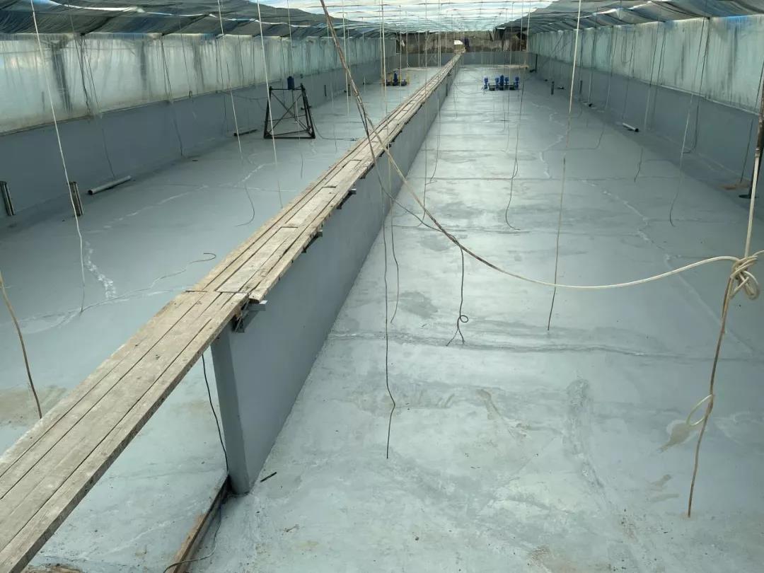 整個大棚的設(shè)計都經(jīng)過計算,占地1.5畝,但是我還是覺得稍大了一些,1畝左右正合適。棚頂采用了三層塑料薄膜,高3米的拱形結(jié)構(gòu),3層膜可以有效的保證冬季的水溫在24℃以上,棚過高容易受大風(fēng)影響損壞,過低則容易積壓雨雪,所以3米高度剛好。另外這種模式對采光要求比較大,薄膜厚度要在0.075-0.08mm之間,養(yǎng)殖池走向最好也是以南北走向最好,更有利于太陽光的采集。養(yǎng)殖池4個角設(shè)計成弧形,一方面避免磨傷對蝦額角,另一方面也更利于池水流動。而所謂的跑道就是在養(yǎng)殖池中間建立一道隔水墻,由進(jìn)水和充氧帶動水體循環(huán)流動,水面上層架設(shè)水車式增氧機增氧推水,底層使用氣石增加底氧和收集污物。