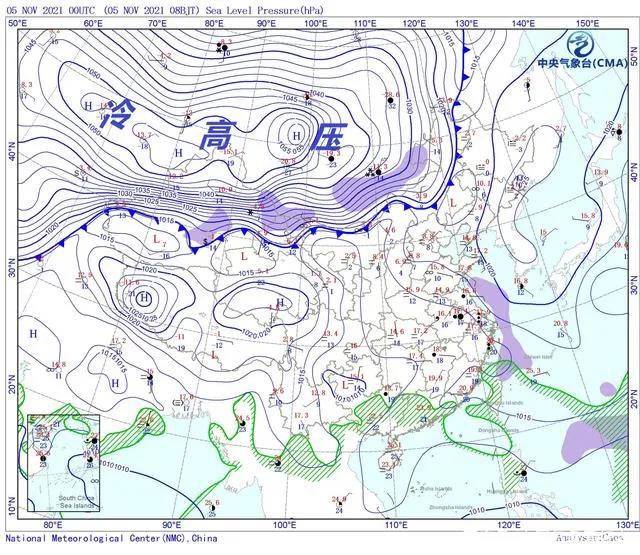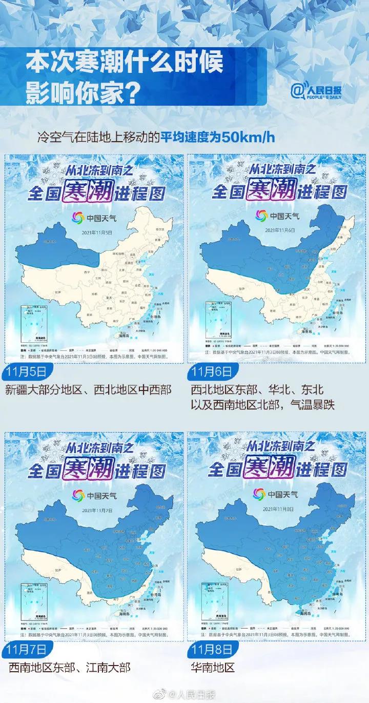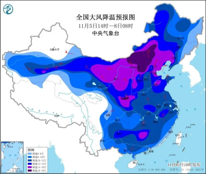 受寒潮影響,11月5日14時至8日08時,我國自西北向東南將有大風降溫天氣過程:大部地區氣溫將先后下降8——10℃,西北地區、內蒙古大部、華北、黃淮、江淮西部、東北地區中南部、江南西南部等地部分地區降幅可達12——14℃,局地16℃以上;并伴有4——6級偏北風、陣風7——8級;8日早晨最低氣溫0℃線位于山東中部、河南中部至四川北部一帶,華南北部最低氣溫將降至10℃左右。
