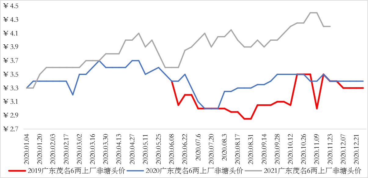 廣西地區(qū):北海廠非0.6-1斤規(guī)格到廠價(jià)最高4.1-4.4元/斤,1-3斤規(guī)格到廠價(jià)5.1元/斤,皆與上周價(jià)格持平;市場(chǎng)非1.5斤上規(guī)格5.3元/斤,南寧1.5斤上規(guī)格5.4元/斤,柳州同規(guī)格5.7元/斤,環(huán)比上周價(jià)格下調(diào)0.1元/斤。