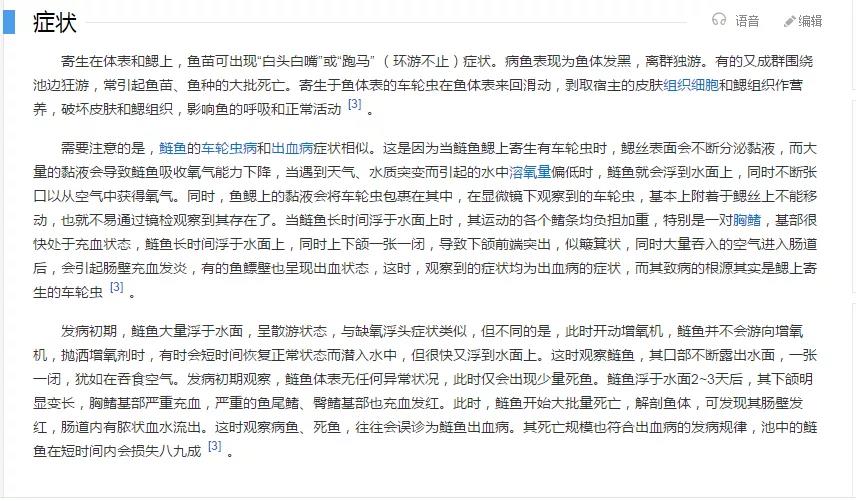 一說到車輪蟲,養殖成品魚的大多嗤之以鼻,認為車輪蟲完全不必考慮。聽到最多的是“車輪蟲真有那么厲害嗎”“車輪蟲以前都沒事”“車輪蟲不是很好弄的嗎”,反正就是一句話,打死也不殺車輪蟲。這種老經驗老思想的人太多太多,先放出百度百科“車輪蟲”的截圖: