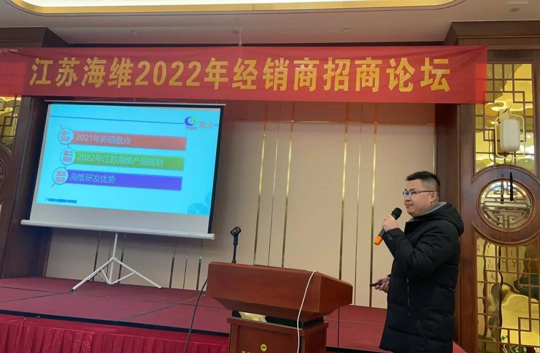本次會議,公司總經理葉勇就江蘇海維的戰略定位及發展規劃向經銷商伙伴進行了隆重介紹。隨后,華東三區魚料技術總監夏華、產品線工程師殷磊分別帶來了有關草鯽混養與黃金鯽養殖的專題分享報告。本次會議也邀請到海大研究院趙金鑫博士,從養殖現狀、產品配方、研發體系等多方面進行介紹。此外,為更好的幫助經銷商朋友解決資金周轉難題,財務經理石叢露對多項融資渠道、操作流程進行了詳細講解。本次江蘇海維招商會對養殖、產品、融資等多方位的介紹,極大的增強了經銷商的經營信心,會場氣氛熱烈,訂貨率超90%,訂貨量達9500多噸。