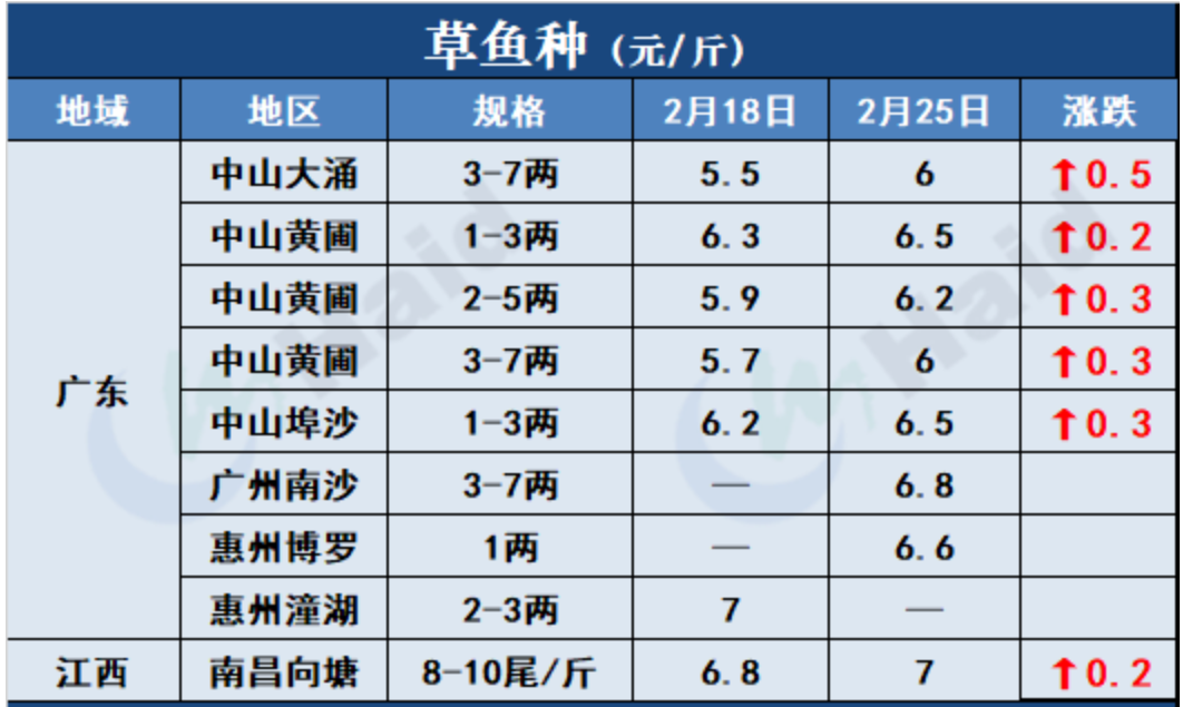 水產前沿網報道,草魚種:廣東中山黃圃由于幾天連續降雨,氣溫急劇下降,魚價開始有所回升,目前3-7兩可以有6元/斤塊,后期還有上升空間。而中山大涌隨著后續外省升溫,抓魚需求逐漸上漲,價格成上漲趨勢;養殖戶目前普遍惜賣,想等待魚價繼續上漲。惠州博羅因天氣回暖,客戶投苗增加,價格也有所提升。