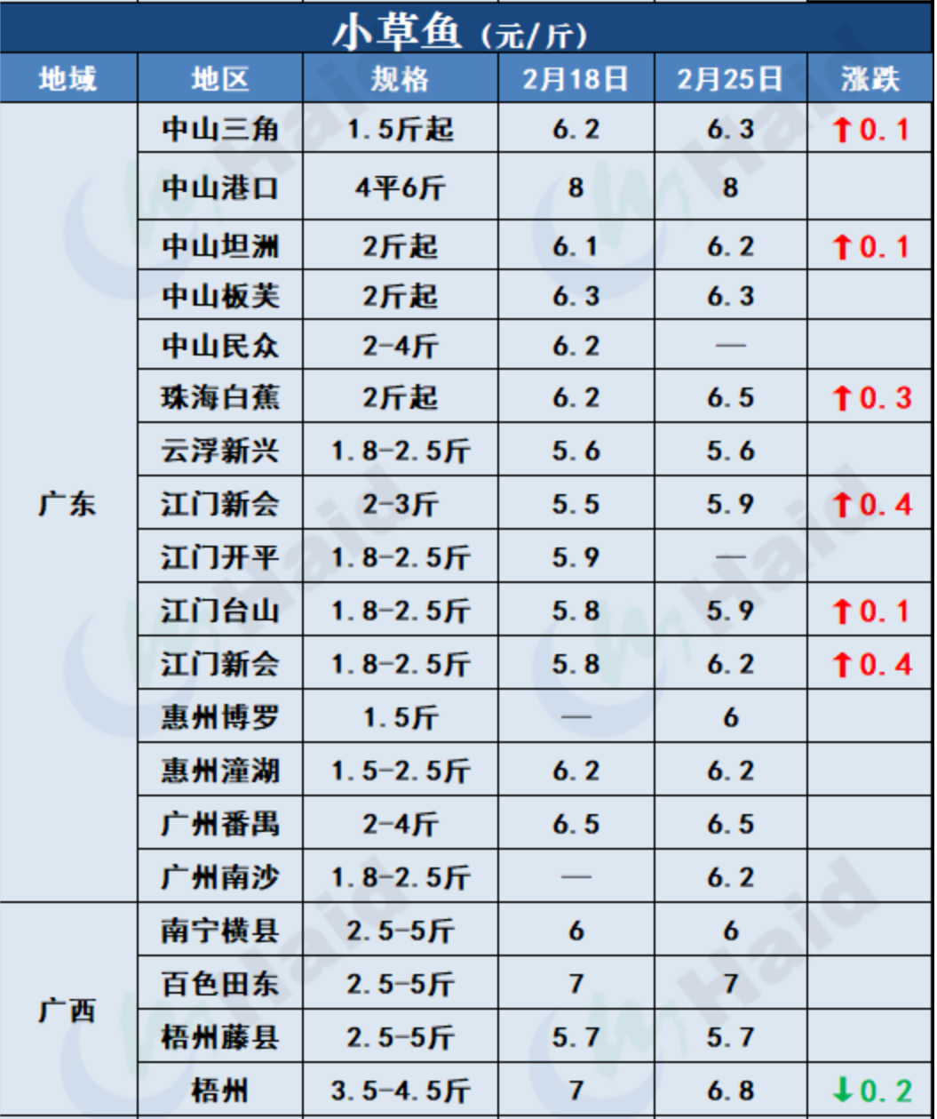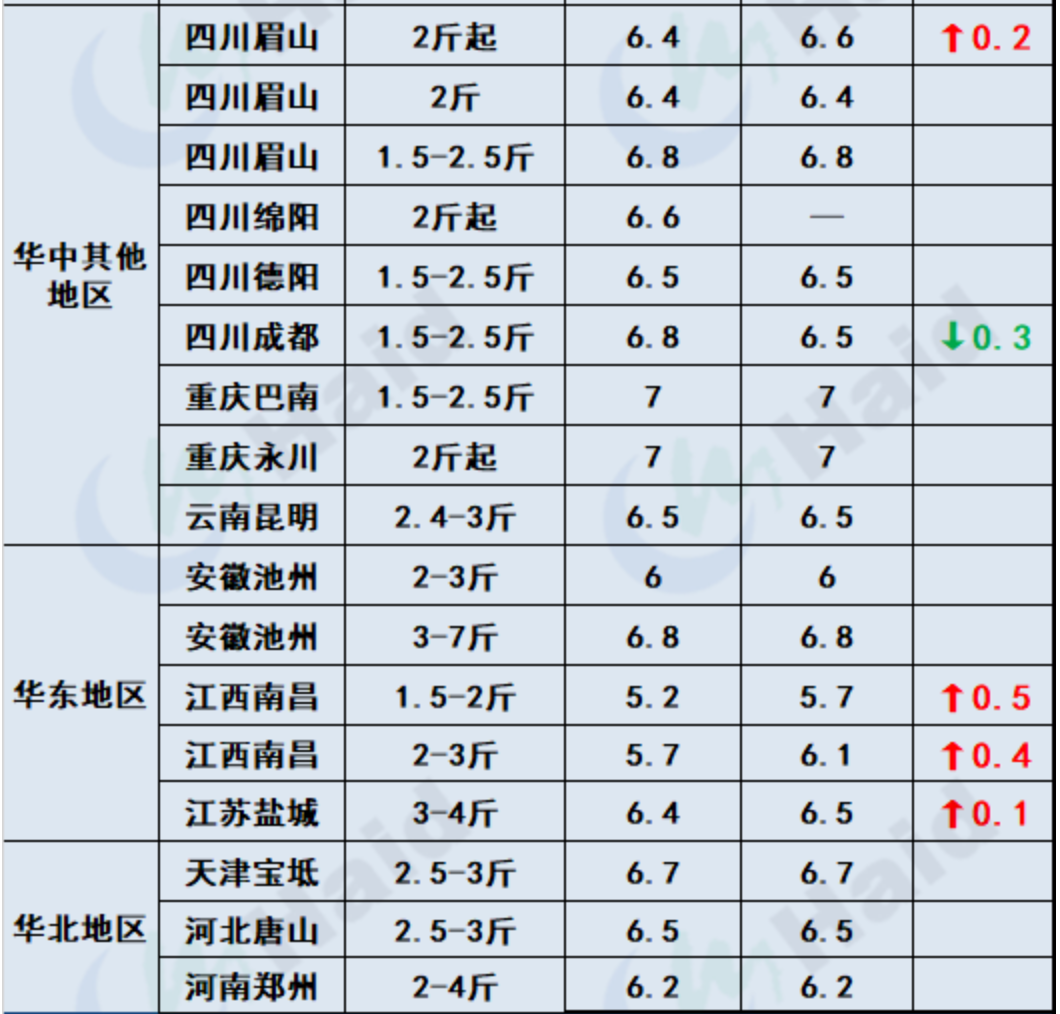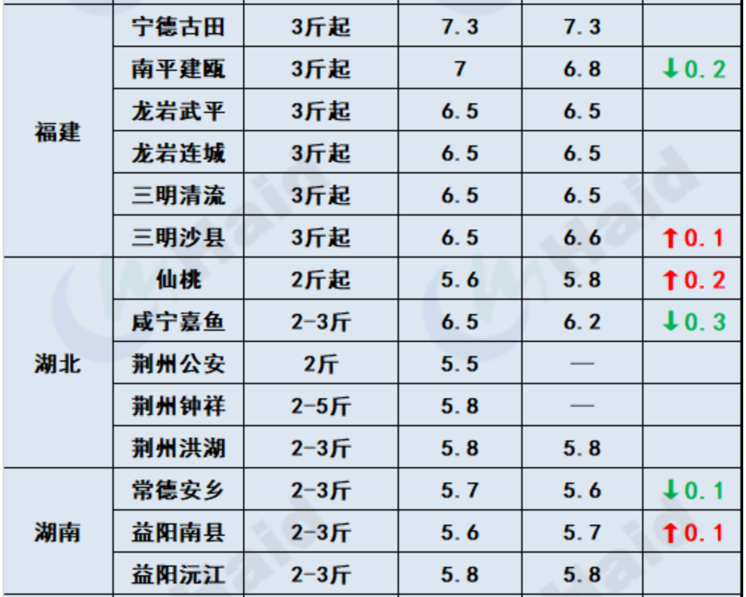大草魚:廣東中山港口年后脆肉鯇出魚量大,空塘補苗需求大,養殖戶存塘惜售。廣西梧州5斤以上草魚存塘量不多,價格有所上漲。湖南岳陽中洲大草魚平8斤塘頭價格7.8元/斤。湖北武漢價格比較平穩,5-8斤草魚,價格在6-7元/斤之間。