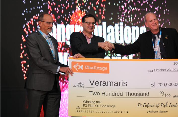 第二屆F3無魚飼料挑戰賽(2018-2019年)的目標是魚油替代創新,找到營養價值相當、經濟可行的魚油替代原料并在水產飼料中推廣應用。來自全球的4只公司團隊參與了比賽,荷蘭替代飼料原料生產商Veramaris及其合作伙伴、厄瓜多爾蝦生產商Empagran組成的團隊脫穎而出,其研發的非魚基omega-3脂肪酸EPA&DHA和ARA銷量奪冠。此次Veramaris奪冠的產品是能夠滿足魚類營養需求、富含omega-3脂肪酸EPA&DHA和ARA(花生四烯酸)的"非魚基"藻油。根據F3的計算,Veramaris銷售的EPA、DHA和ARA數量相當于通過本次挑戰賽而保護了近20億尾魚類群體的90%。由帝斯曼和贏創共同創建的Veramaris公司擅長為水產養殖業提供EPA,DHA和ARA的高質量來源,從而助力解決整個行業未來增長和績效的瓶頸難題。Veramaris首席執行官Karim Kurmaly在印度欽奈舉行的全球水產養殖聯盟目標大會上的頒獎儀式上表示:“我必須感謝整個價值鏈上那些勇敢的領導人的合作,鼓勵了大家進行不斷創新來確保水產養殖業的可持續發展!