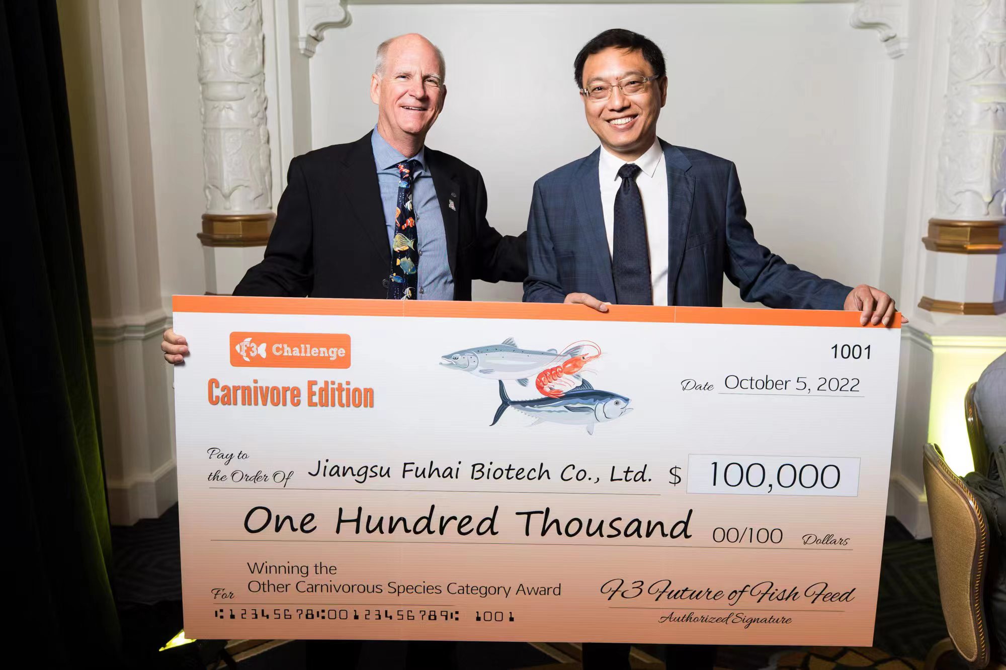 2022年10月5日,F3團隊在美國西雅圖召開的全球水產養殖聯盟GOAL大會上宣布,三家飼料公司—Star Milling、Empagra和江蘇富海生物科技有限公司—在本屆針對肉食性魚類的無魚飼料挑戰賽中勝出,分別贏得100000美元的獎金。亞利桑那大學教授兼F3挑戰賽主席凱文-菲茨西蒙斯在GOAL會議的頒獎儀式上說:“我們衷心祝賀所有的參賽公司,克服了疫情和供應鏈中斷等諸多逆境,仍然堅持參與挑戰。他們的努力和堅持得到了回報"。