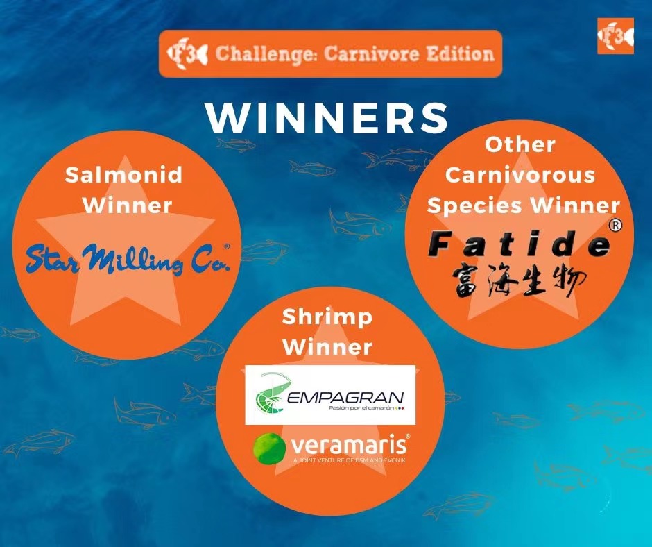 第三屆F3無魚飼料挑戰賽(2020-2022年,受疫情影響,中途暫停了一段時間)關注肉食性物種的無魚飼料研發。比賽分設三個類別:鮭、蝦和其他肉食物種。F3無魚飼料挑戰賽是一項銷售競賽,由在上述指定類別中生產和銷售最多"無魚基飼料"的參賽公司勝出,要求參賽飼料不能使用野生魚類原料或者任何海洋動物成分。來自全球的6家參賽團隊提交了8種符合參賽要求的無魚飼料,并從2020年10月1日起開始記錄銷售額。比賽歷時約16個月,所有類別銷售了超過300萬公斤的飼料,節約并拯救了超過9500萬條野生餌料魚。